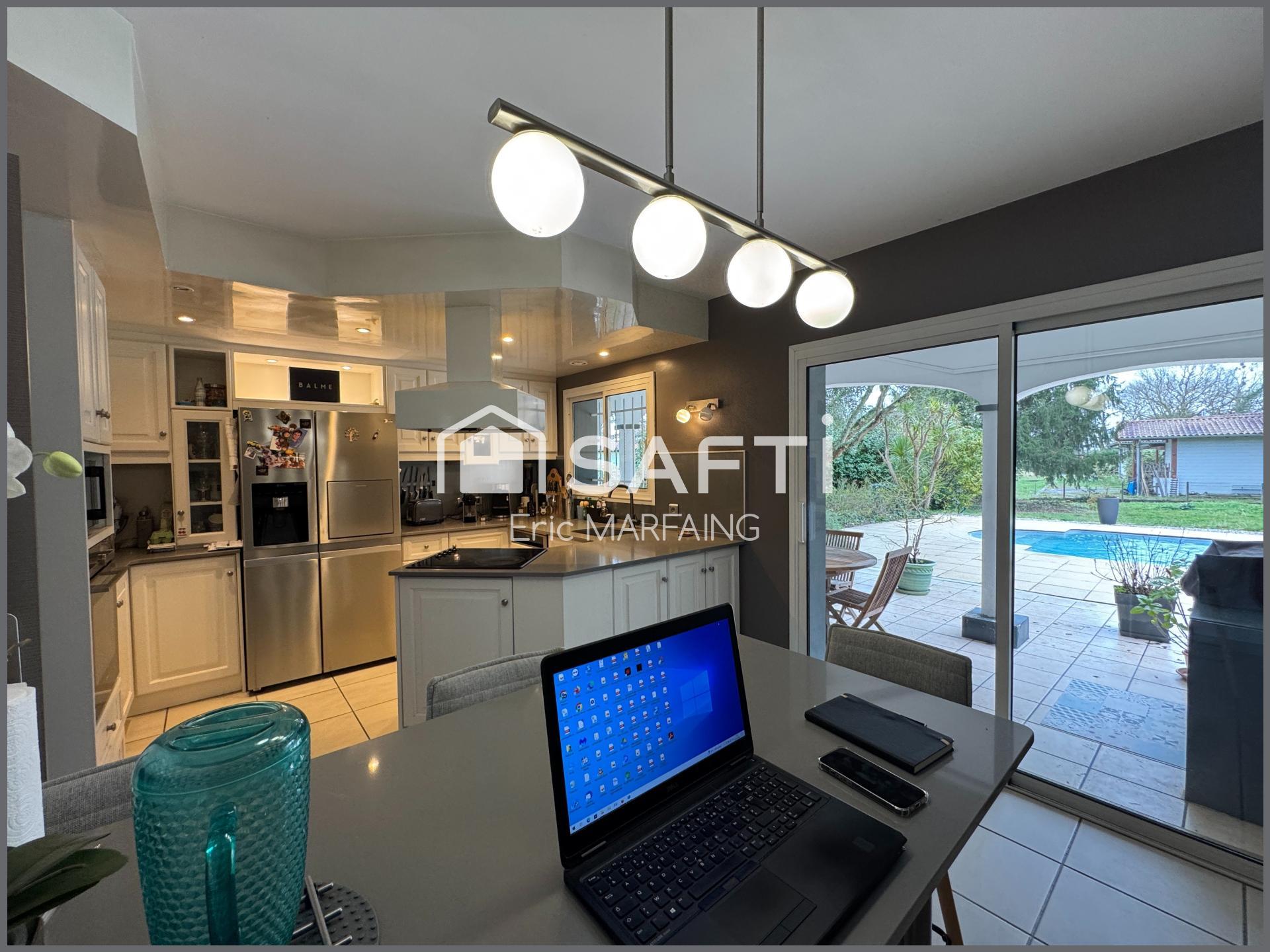 Villa d’architecte de près de 200 m² habitables, en parfait état et sans travaux, implantée au cœur d’un parc arboré de 2 000 m², soigneusement entretenu en vente exclusive par Éric Marfaing Safti Immobilier.
