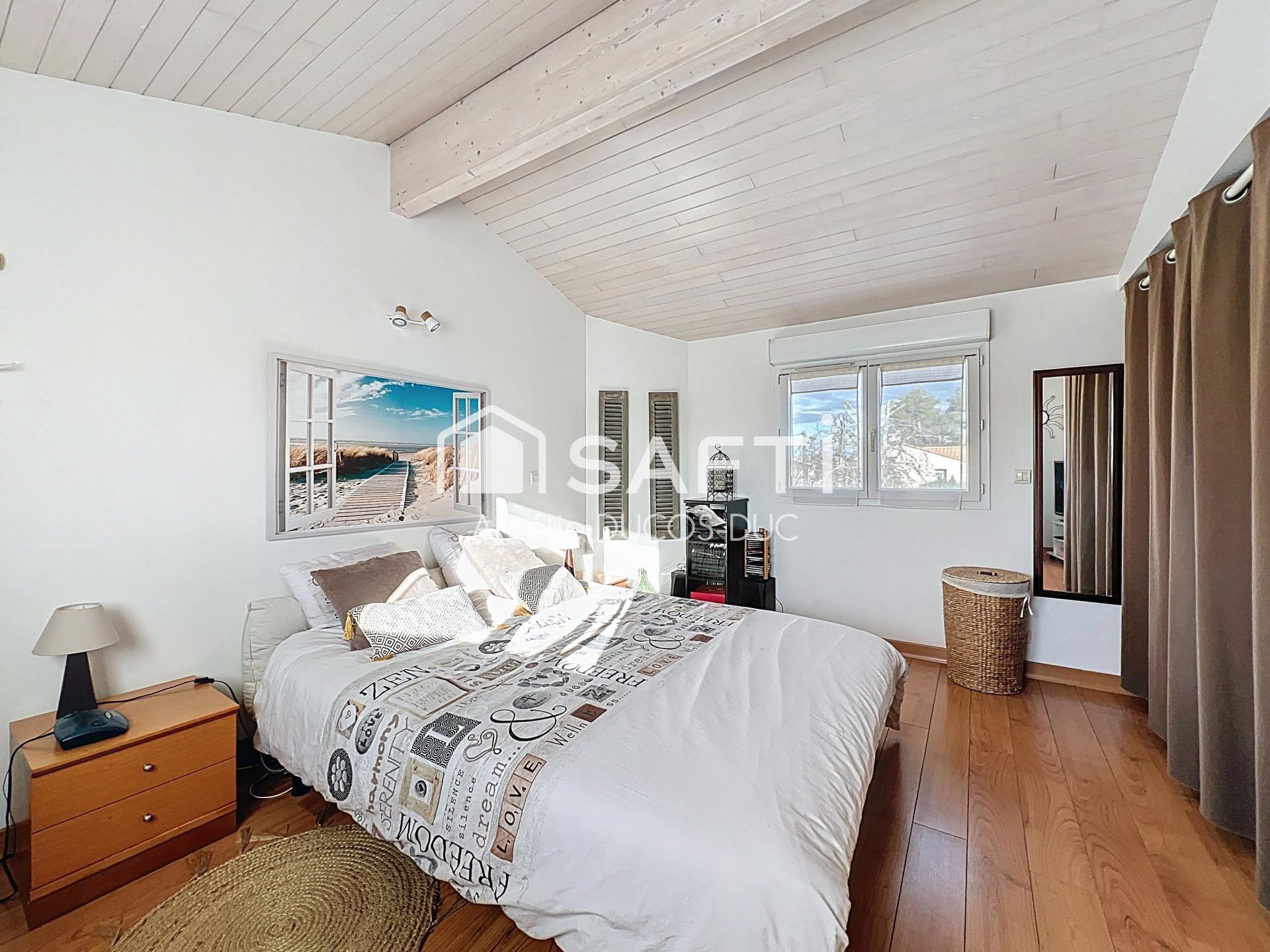 Dès l’entrée, la pièce de vie de plus de 56 m² séduit par ses volumes et sa luminosité, avec une cuisine ouverte et un accès direct vers l’extérieur. Organisée en demi-niveaux, la maison propose aujourd’hui trois chambres, dont une suite parentale indépendante avec salle d’eau et WC. Une grande chambre d’environ 20 m² permet facilement la création d’une quatrième chambre selon les besoins.