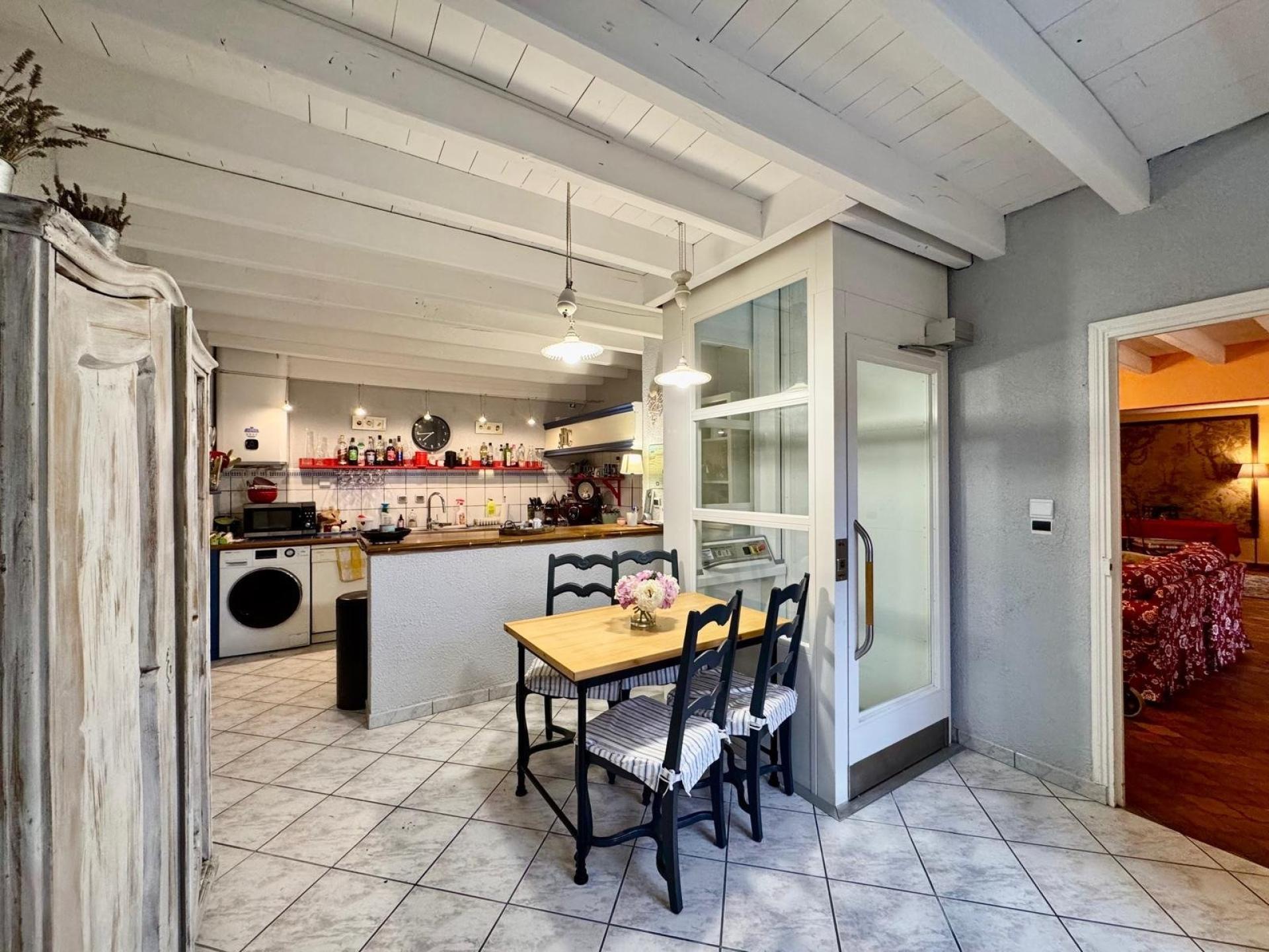 Au rez-de-chaussée, la maison offre une grande salle de vie conviviale agrémentée d’une cheminée, idéale pour les soirées d’hiver, ainsi qu’une cuisine équipée et aménagée. Un ascenseur vient compléter ce niveau et apporte un confort appréciable.