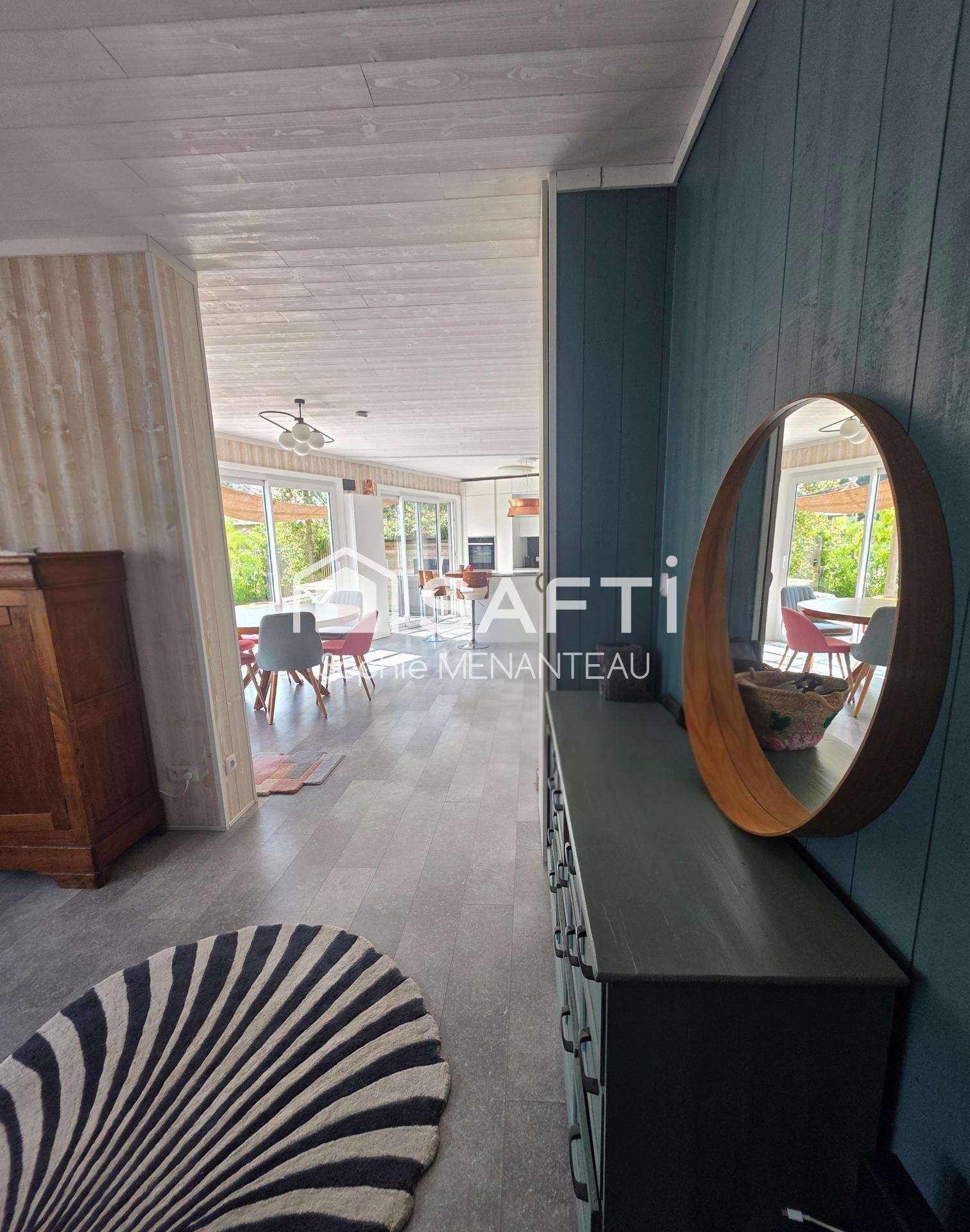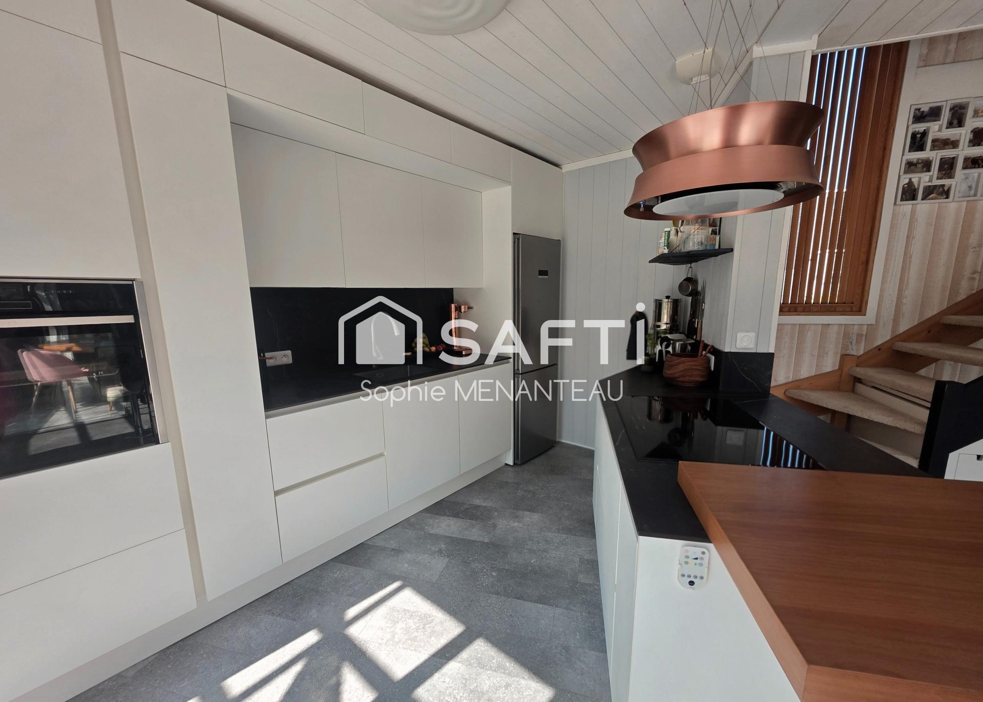 La cuisine ouverte est entièrement équipée et baignée de lumière grâce à de grandes baies vitrées donnant sur une vaste terrasse ombragée exposée plein sud.