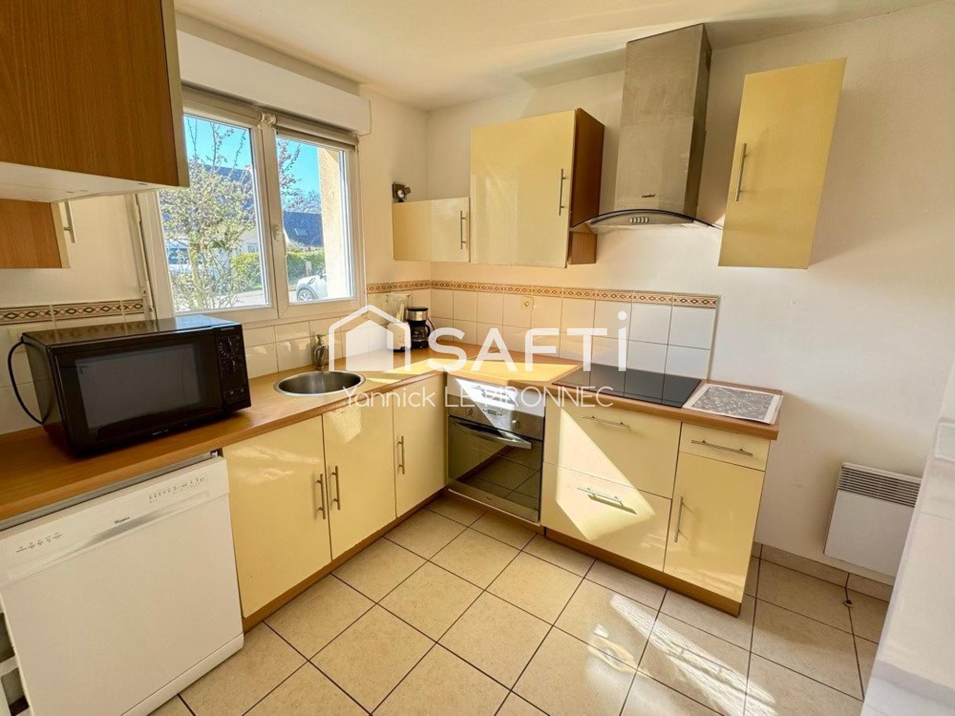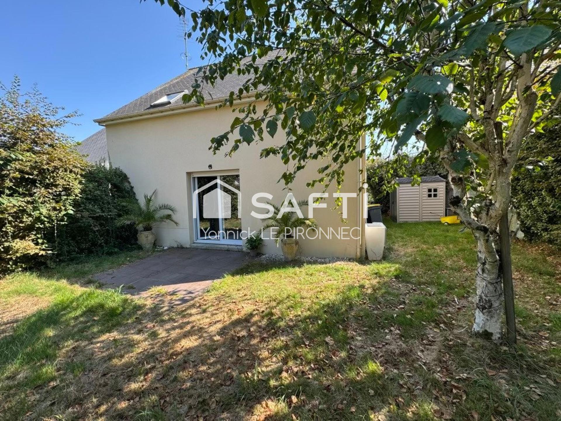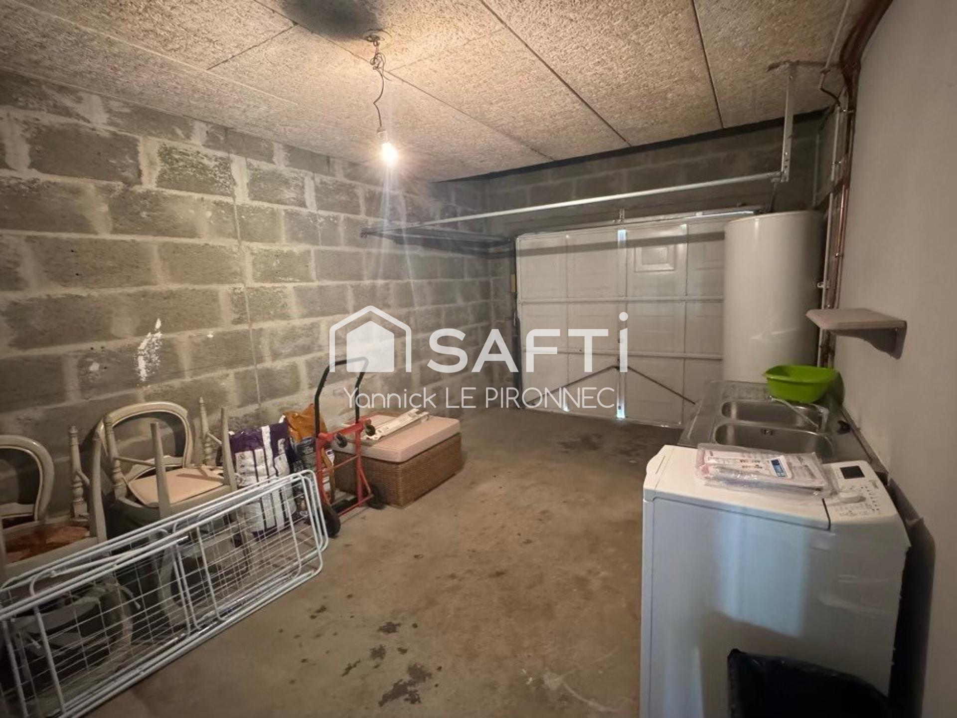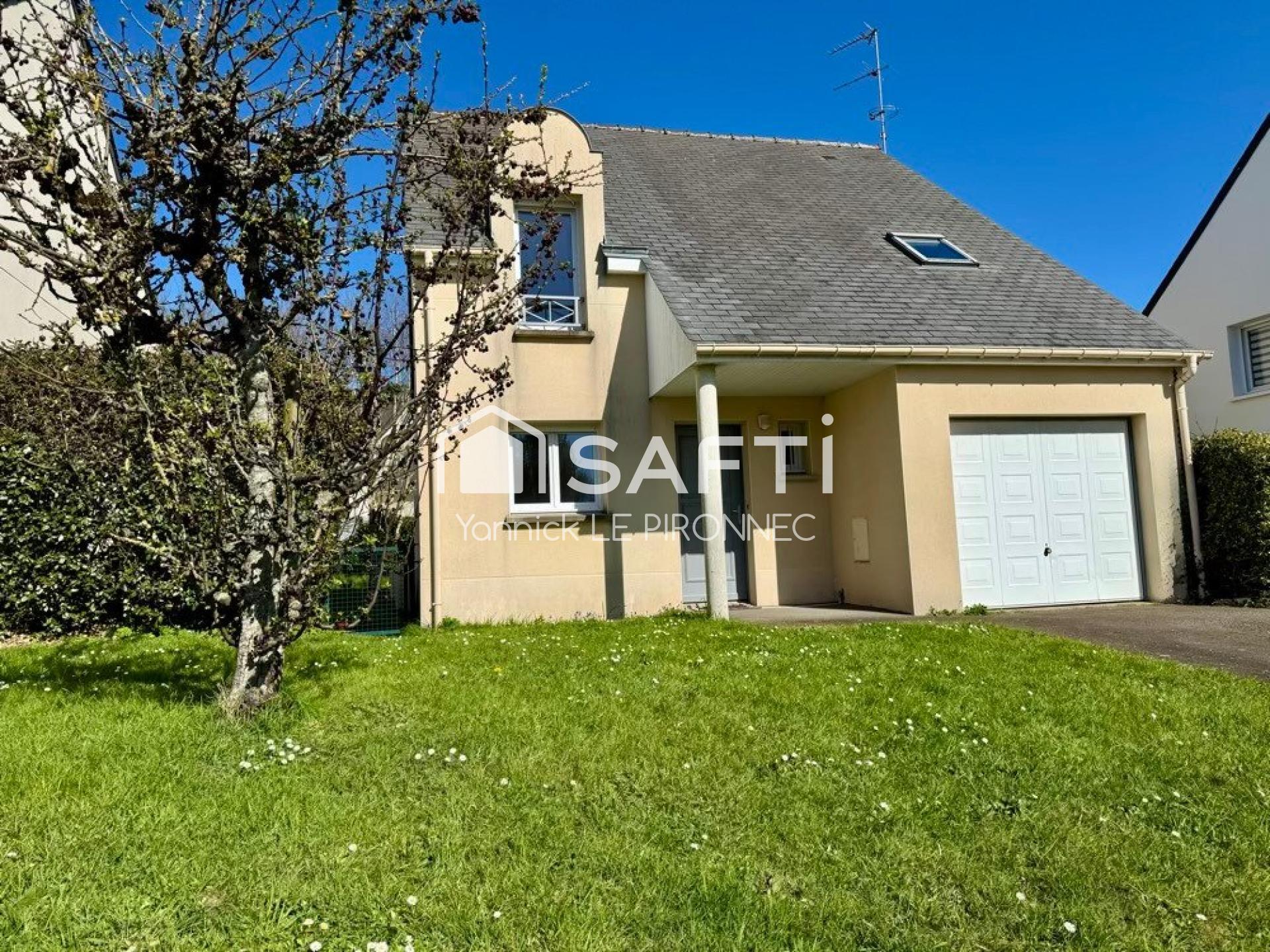 À l'intérieur, cette maison T5 de 107 m² se compose d'une entrée, d'une cuisine équipée, d'un WC, d'une lumineuse pièce de vie donnant sur une terrasse, et d'un garage attenant avec coin cellier. À l'étage, on trouve un palier, un WC, une salle de bain et trois chambres, dont une modulable en deux selon les besoins. Construite en 2001, cette propriété offre une pompe à chaleur et un assainissement collectif.