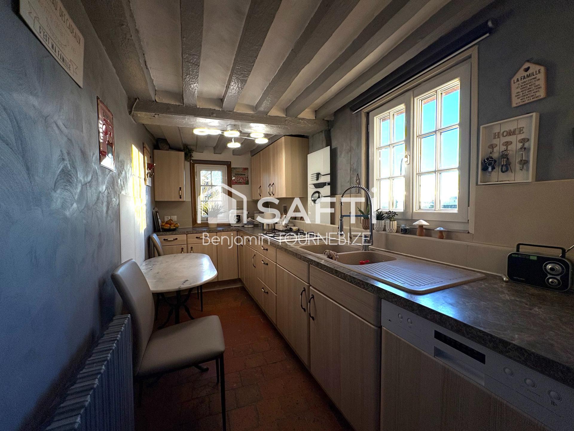 La maison principale, au charme normand, associe matériaux nobles et volumes généreux : un salon lumineux avec cheminée équipée d’un insert, une cuisine contemporaine ouverte, et plusieurs pièces accueillantes. La seconde maison, plus contemporaine, offre un potentiel d’aménagement modulable selon vos besoins, dans une atmosphère épurée et chaleureuse.