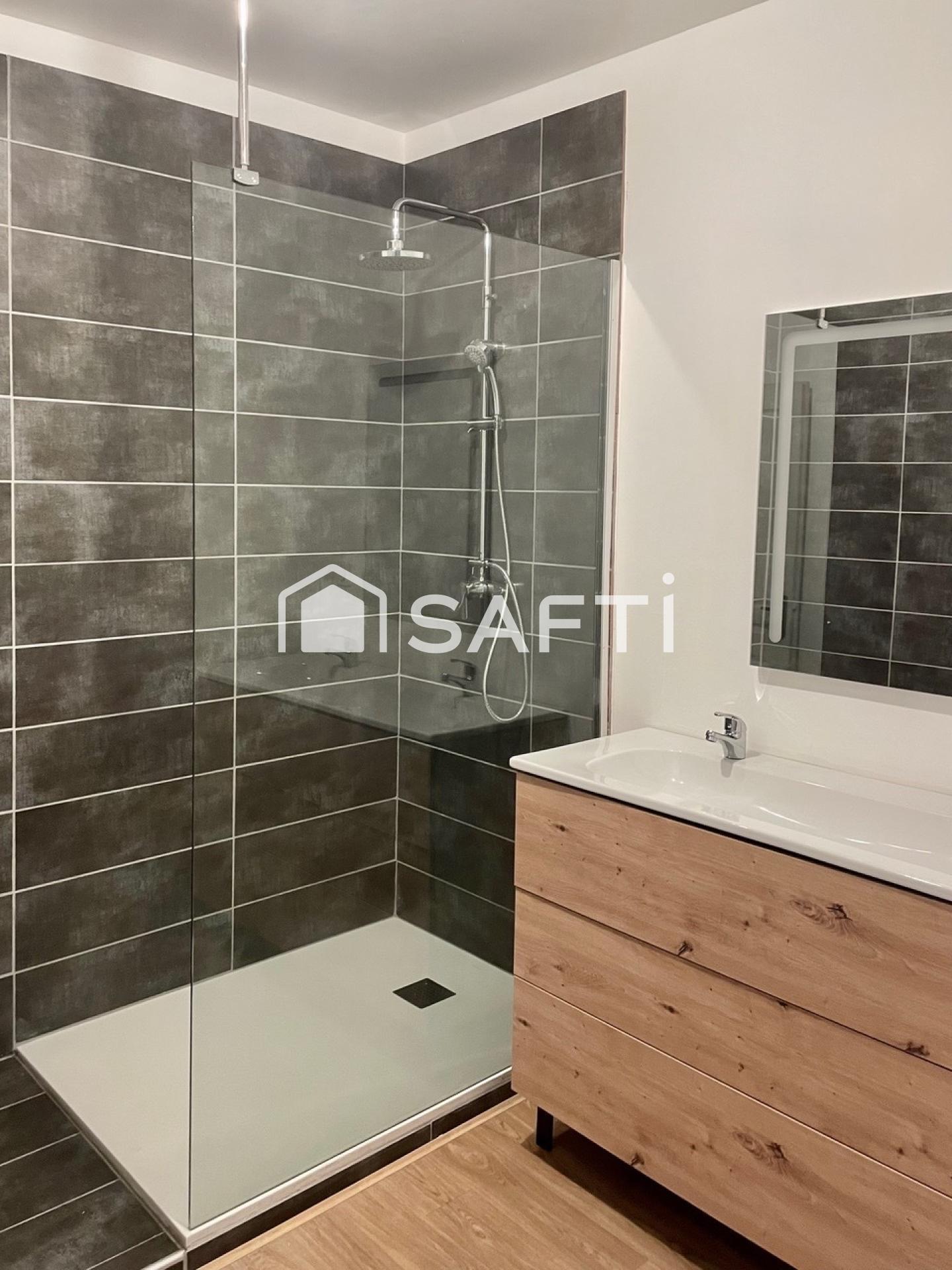 Cuisine équipée, salle d’eau, séjour lumineux ouvrant sur une terrasse de 21m².