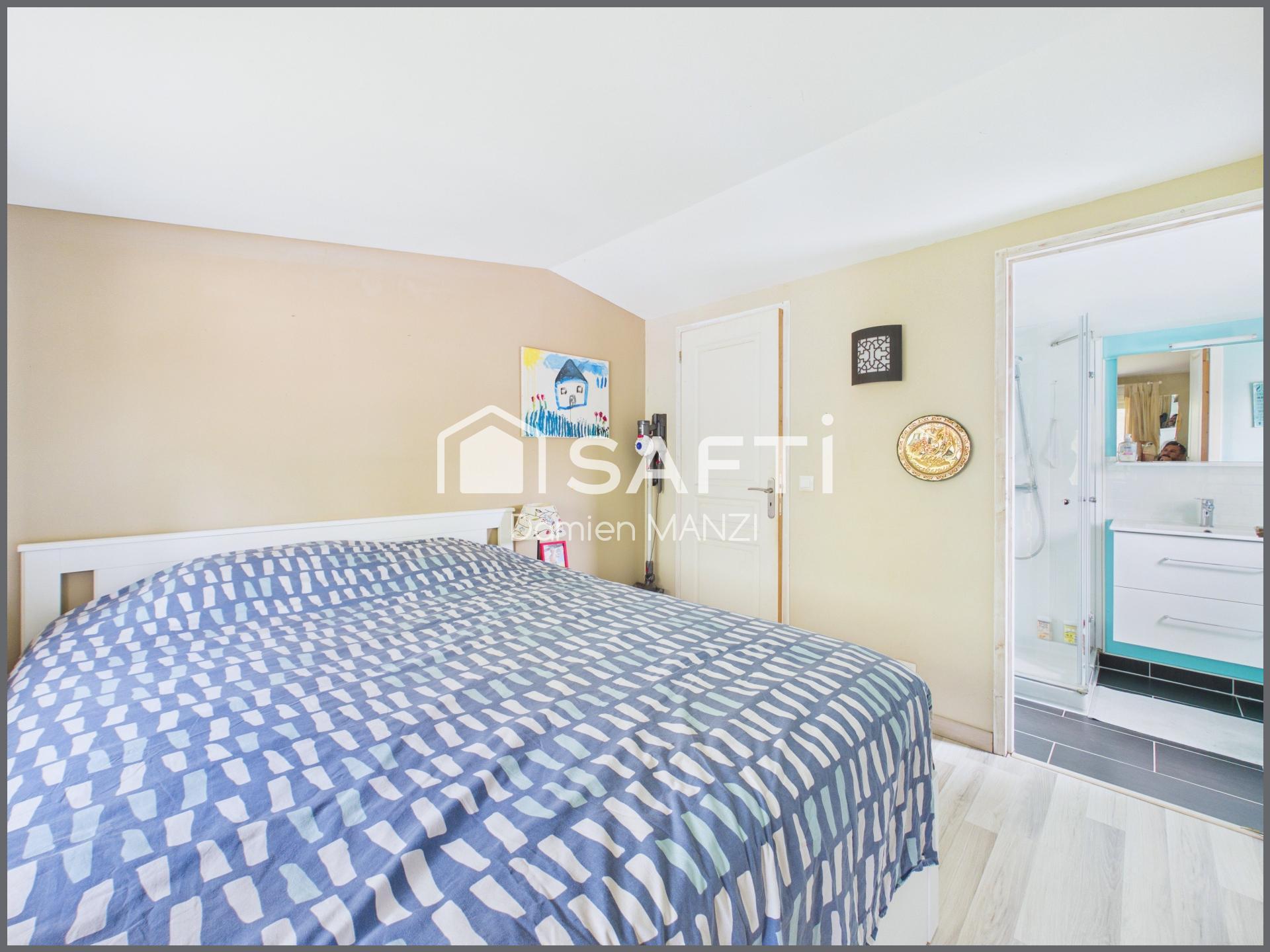 À l'étage, une chambre parentale avec sa salle d'eau, un wc et des placards qui offrent de l'intimité et du confort.