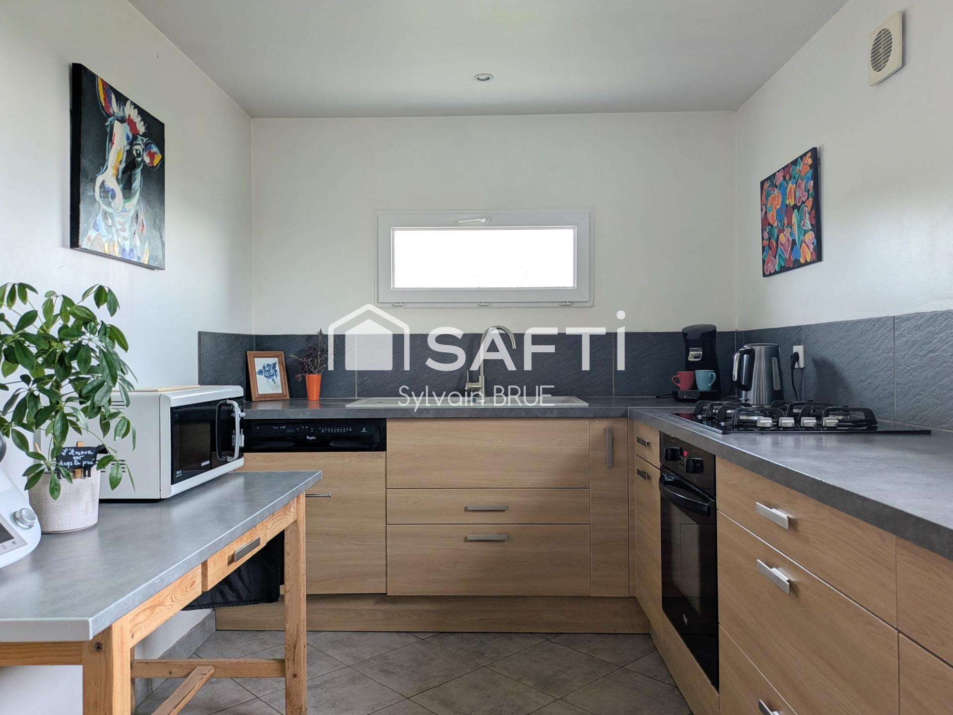 Spacieuse et lumineuse, la maison propose un séjour convivial ouvert sur l’extérieur, une cuisine équipée, trois chambres, une salle d’eau, deux WC, une buanderie et une salle de jeu.