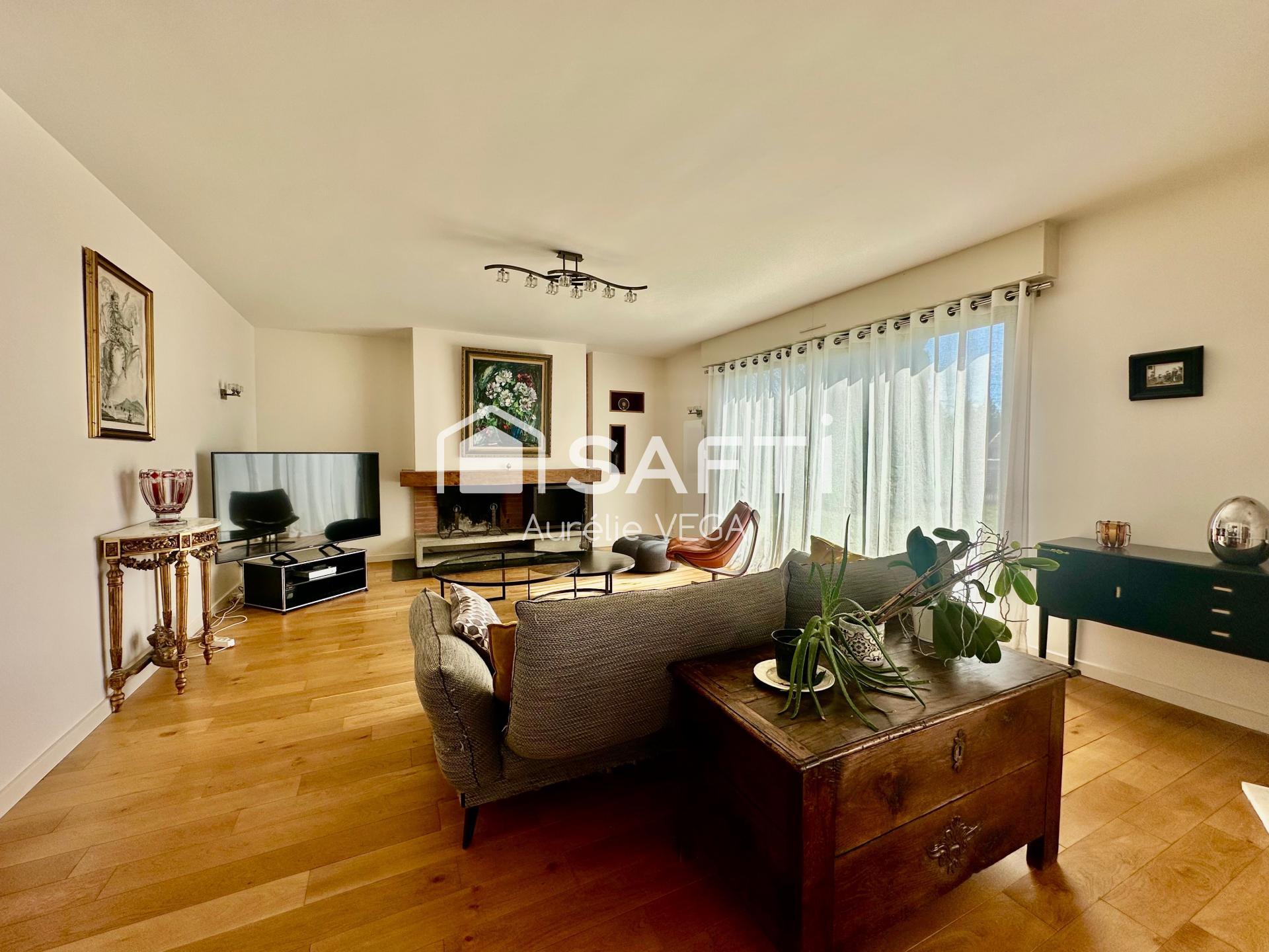 un magnifique salon baigné de lumière, avec cheminée et parquet en chêne.