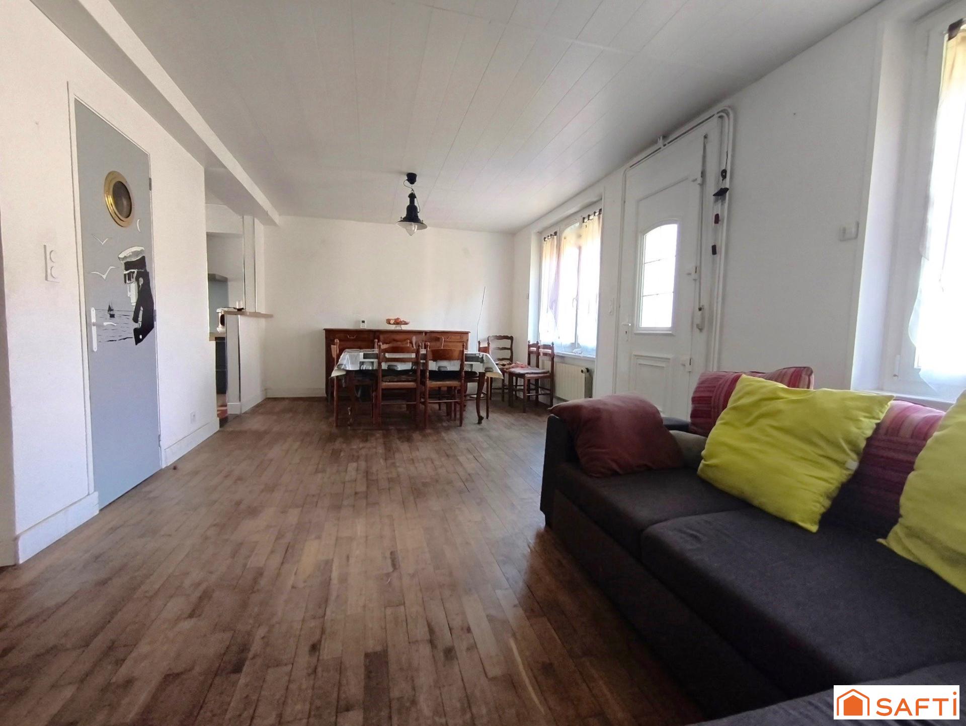 Située à deux pas du bourg, à seulement 10 minutes en voiture des plages, maison familiale de 100 m2 composée au rez-de-chaussée d'un salon-séjour lumineux avec cuisine ouverte de 40 m2 environ, d'une salle d'eau avec wc , d'un espace buanderie et d'un vaste garage avec mezzanine.