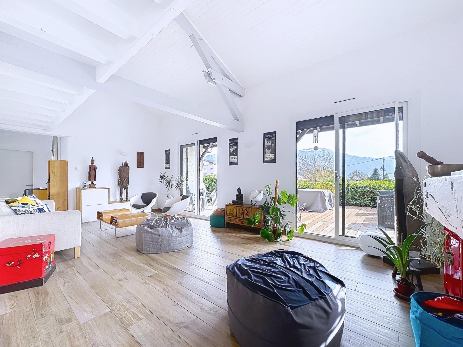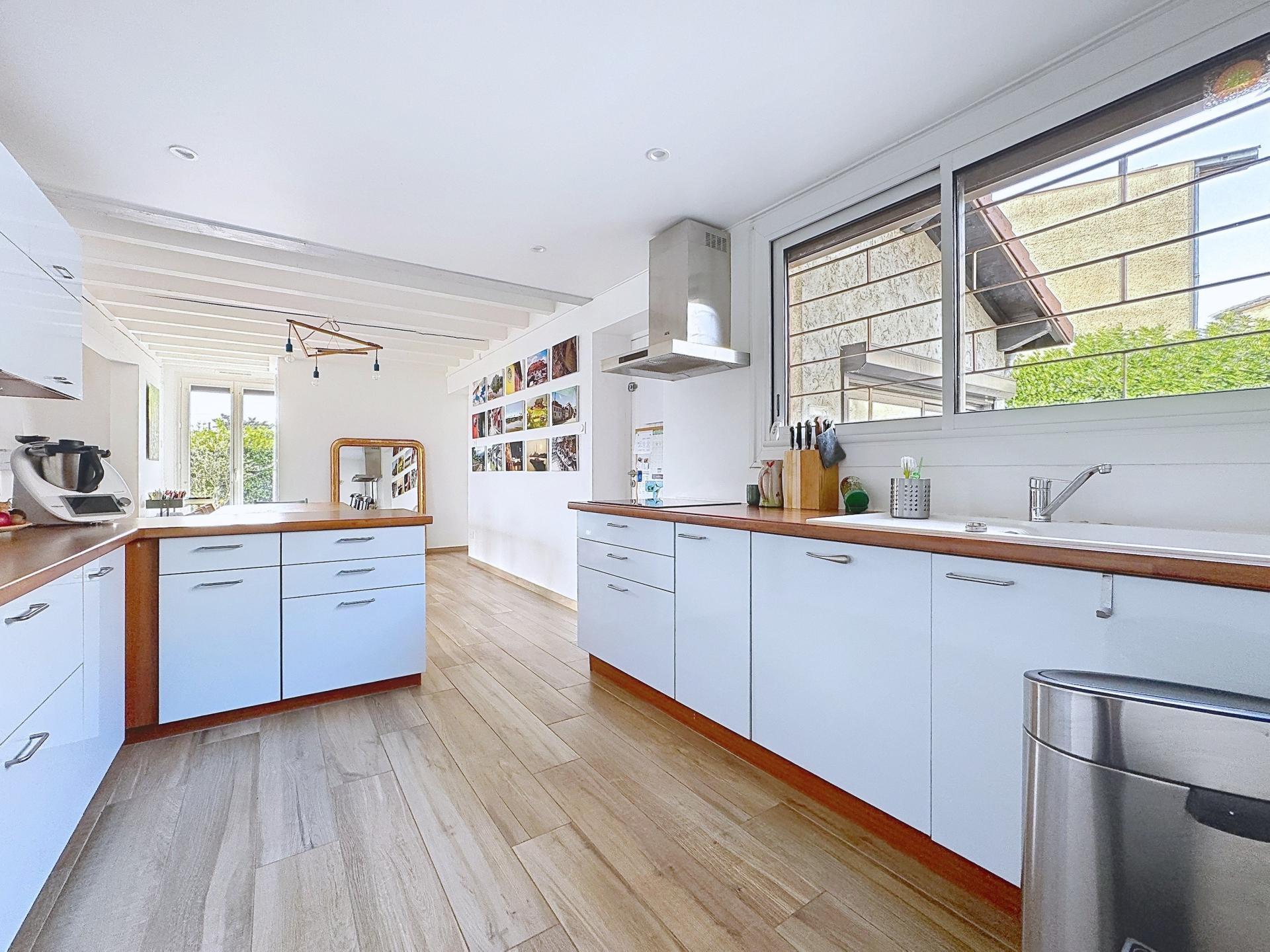 Cette maison de 1974, 139 m² habitables, 215 m² utiles, rénovée en 2020, est située sur une parcelle de 1750 m² en hypercentre (commerces, écoles et gare à moins de 5 min à pied) dans une rue calme de Moirans. Le hall d’entrée conduit à un large espace de vie, comprenant cuisine, salle à manger, séjour 50 m². Cet espace lumineux grâce à de nombreuses baies, ouvre sur une vaste terrasse avec vue sur la Chartreuse et le Vercors. En complément, une suite parentale de près de 17 m² sur terrasse et jardin: douche italienne, vasque, WC séparé, placards toute hauteur. A l'étage, une large mezzanine et des combles aménageables. Depuis le hall d'entrée à gauche : 3 belles chambres dont 2 avec porte fenêtre vue montagne, salle de bain et WC séparé, rangements. Le chauffage est assuré par des sources complémentaires : radiateurs à inertie, PAC air/air (réversible), cheminée à bois avec insert, poêle à granules. Eau chaude sanitaire cumulus électrique. Un grand jardin sans vis-vis et deux grands garages indépendants complètent l’ensemble. VISITE VIRTUELLE.