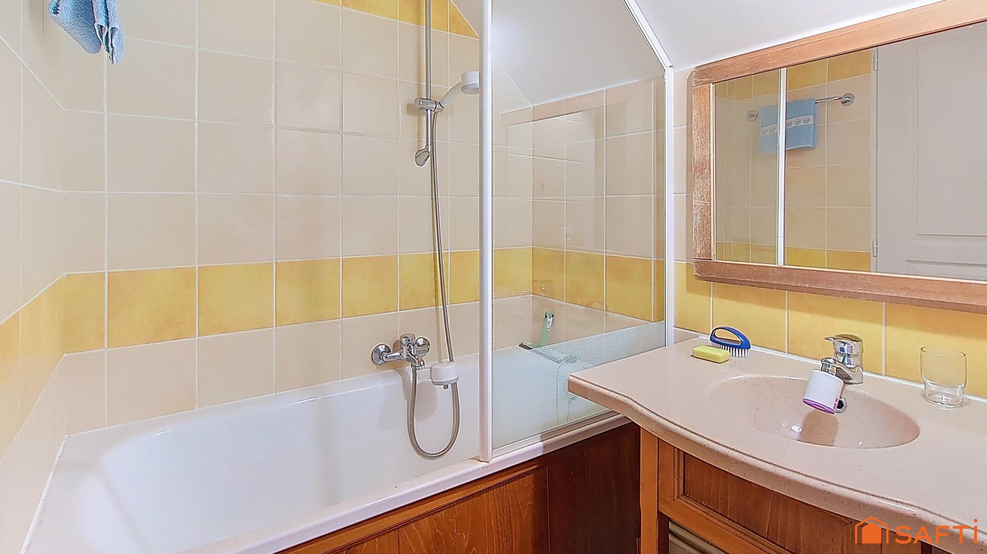 À l'étage, une chambre confortable vous attend, accompagnée d'une salle de bains moderne comprenant également un WC.