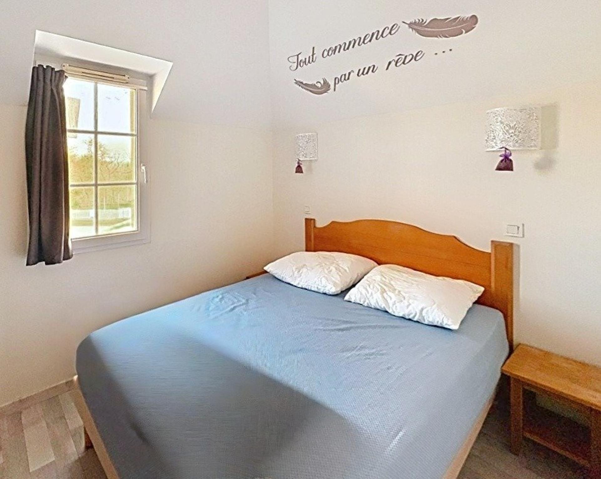 À l’étage, l’espace nuit se compose de deux chambres et d’une salle de bains avec WC, offrant un agencement pratique et confortable.
