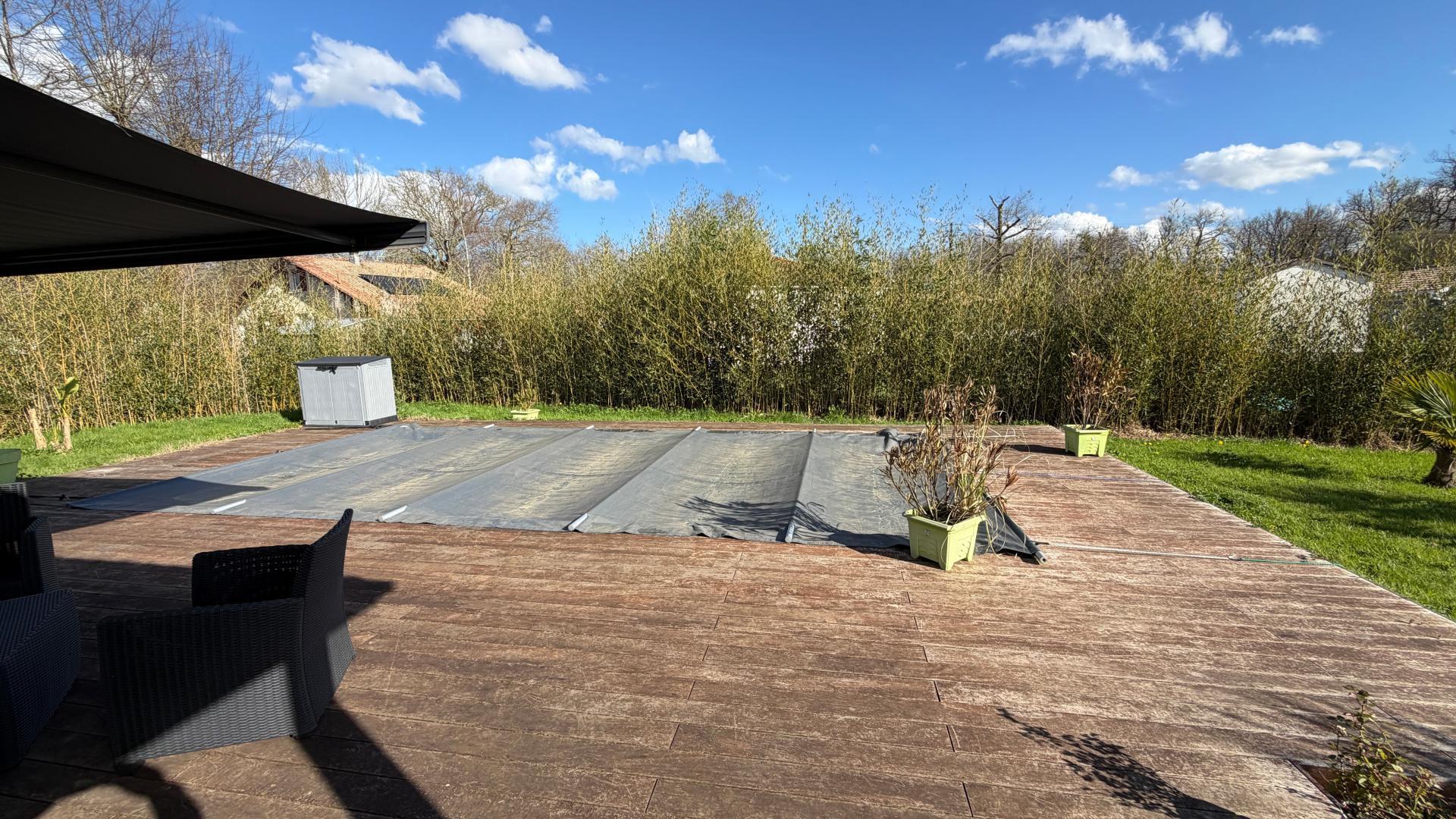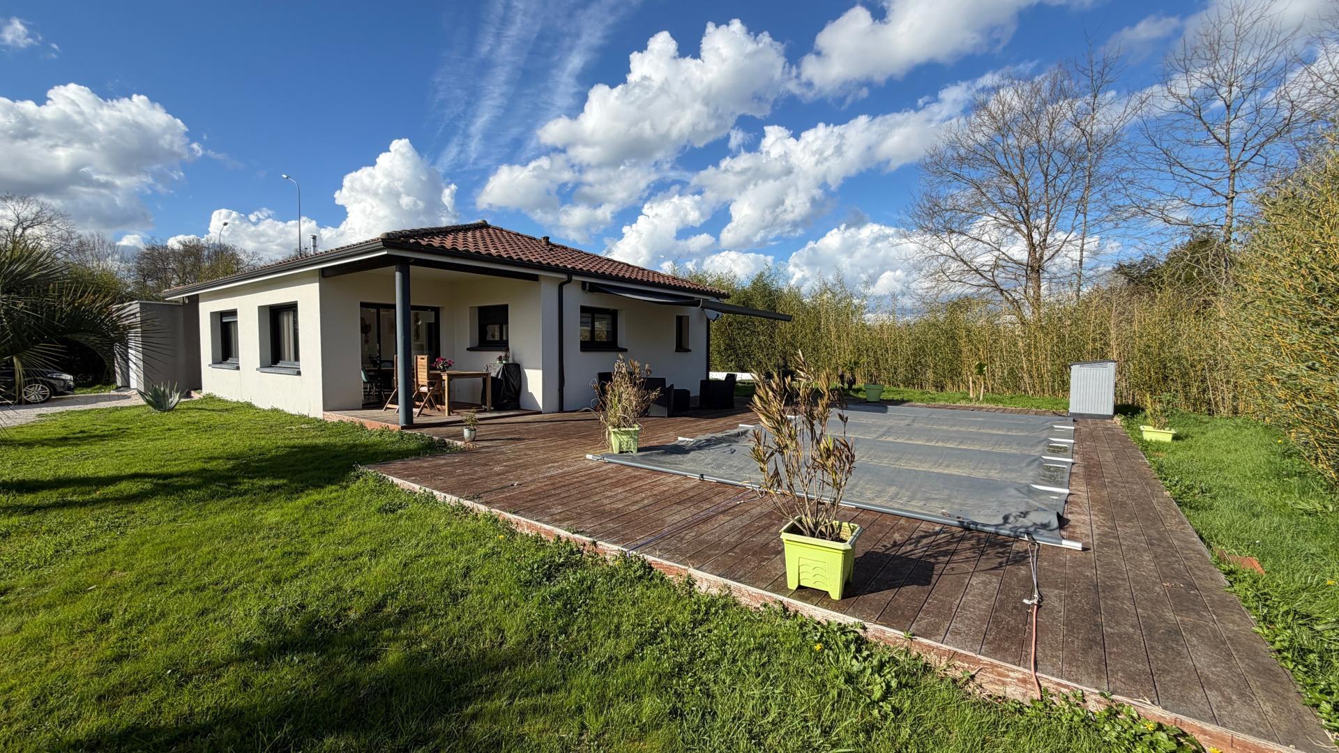Mont de Marsan 5 min Située sur la Commune de Benquet cette belle maison contemporaine ne vous laisse pas indifférent de plain pied de type F5 avec son espace salon séjour spacieux et lumineux donnant sur une terrasse abrité, cuisine ouverte aménagée et équipée, 3 chambres avec placard, salle d'eau avec une douche à l'italienne, cellier buanderie avec un adoucisseur d'eau, le tout sur un terrain de 1460 m² environ sans vis à vis. La maison dispose d'un garage attenant de 18 m² environ, une belle terrasse en bois exotique d'environ 50 m² avec une piscine sécurise de 8/4. belle acquisition