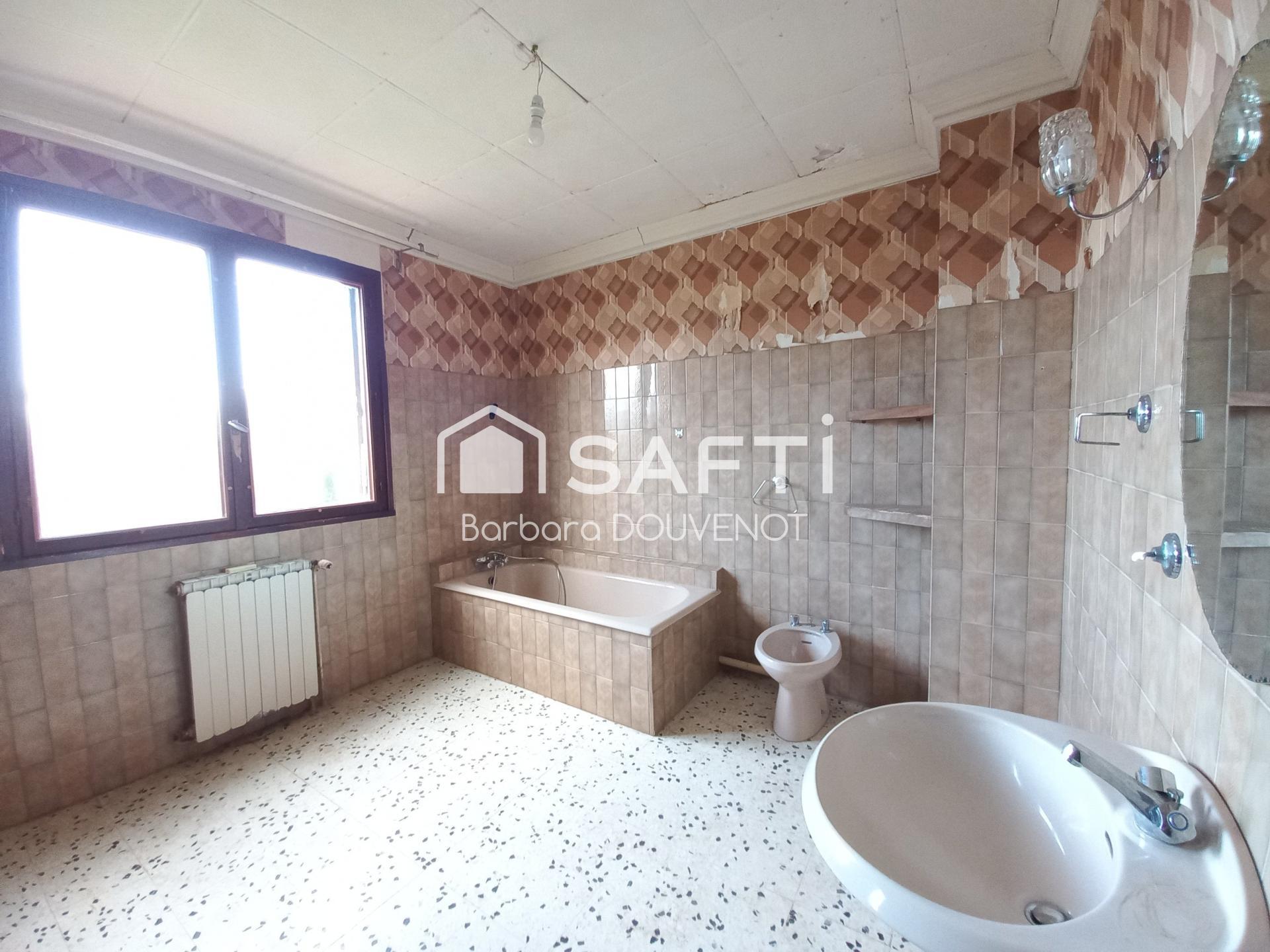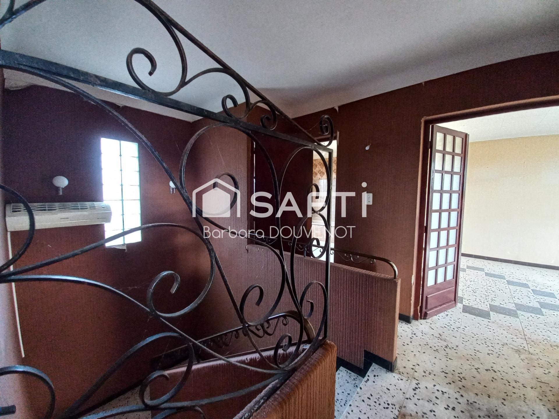 Maison de 114 m² à rénover avec jardin piscinable sans vis-à-vis, 2 garages + stationnement sur le terrain.