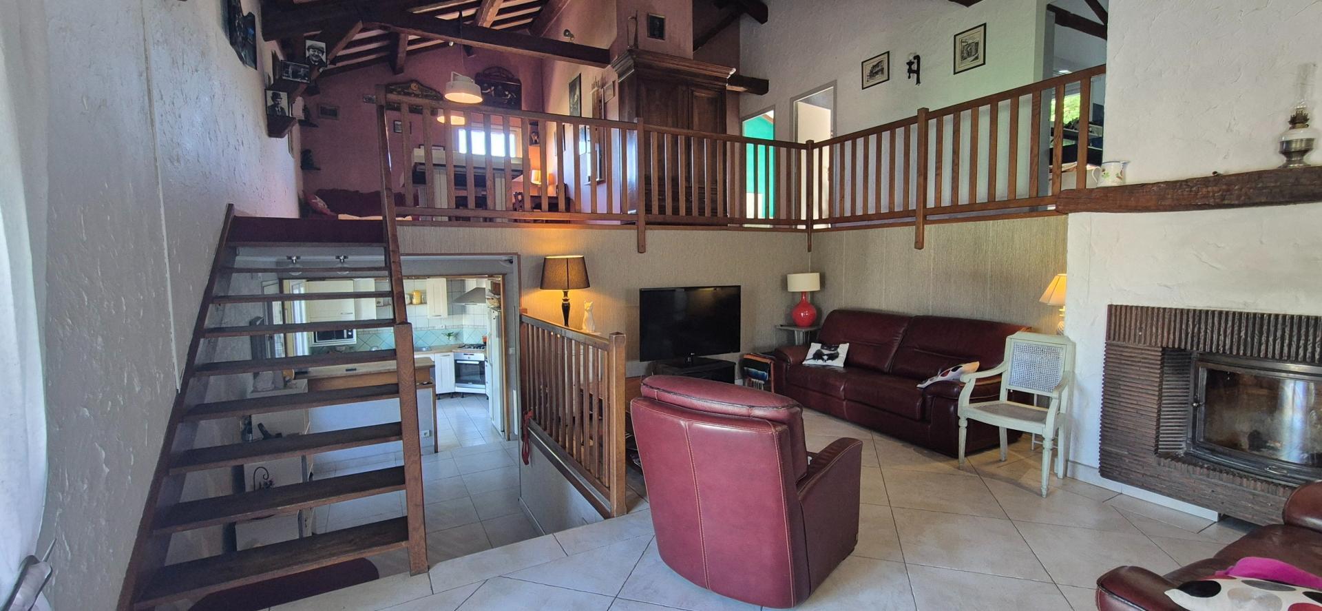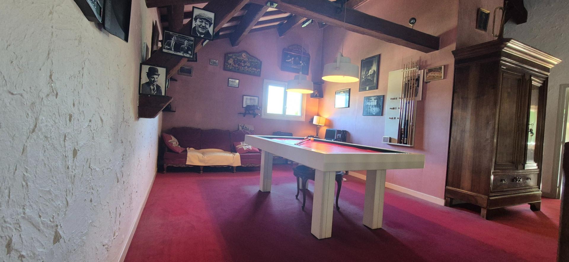 Dès l’entrée, vous serez séduit par une superbe pièce de vie cathédrale, baignée de lumière, comprenant un salon chaleureux avec cheminée, une salle à manger conviviale et un vaste espace actuellement aménagé en coin billard, pouvant également accueillir un coin détente ou de bureau. La cheminée centrale permet de chauffer efficacement l’ensemble de la maison, apportant confort et authenticité.