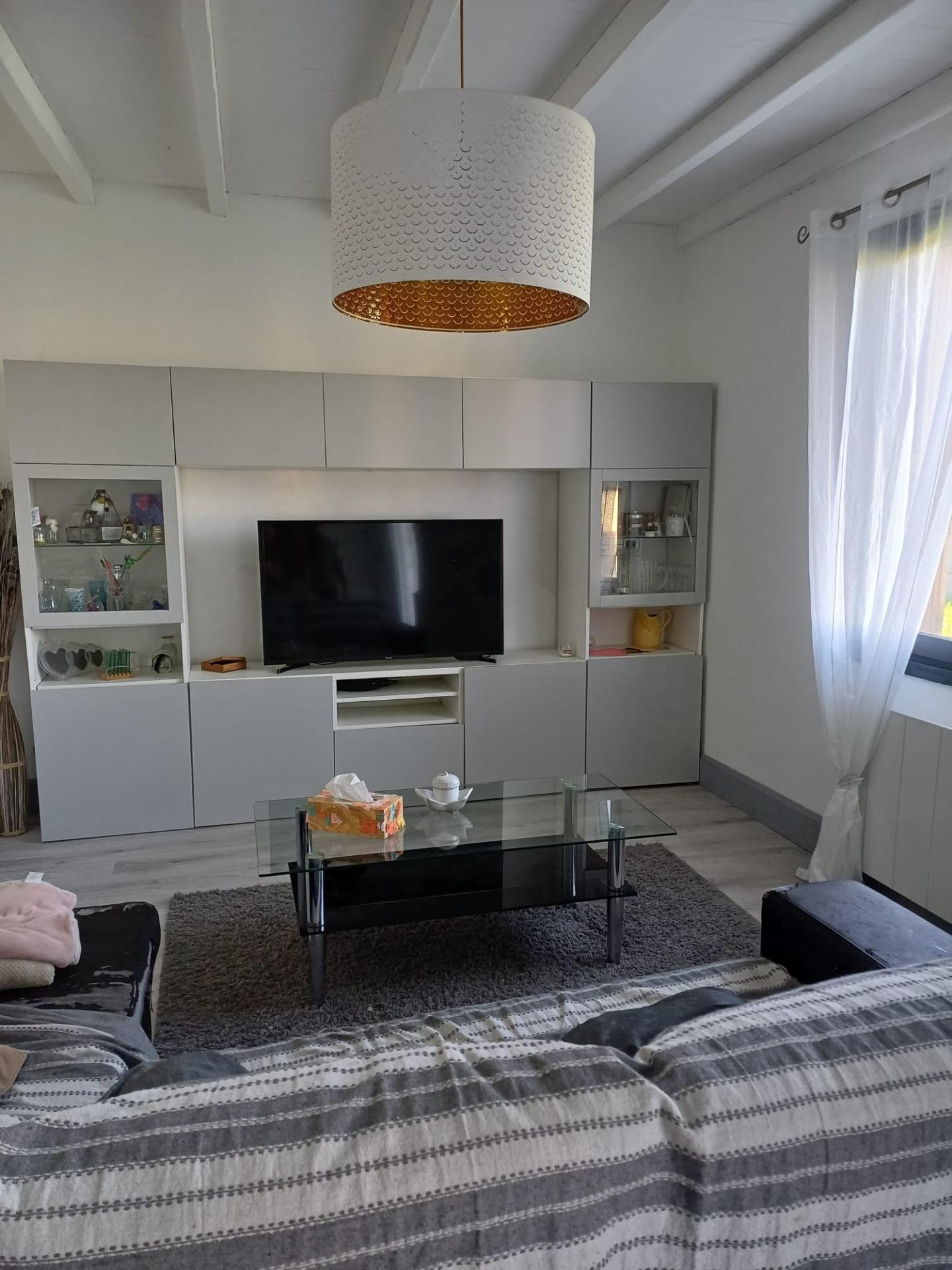 Au rez-de-chaussée : entrée desservant un couloir menant à deux chambres (actuellement salle de jeux et bureau), placard technique sous escalier, grande pièce de vie lumineuse avec coin salon et cheminée ouverte (non fonctionnelle), cuisine équipée semi-ouverte, WC avec lave mains, salle d’eau avec double vasque
