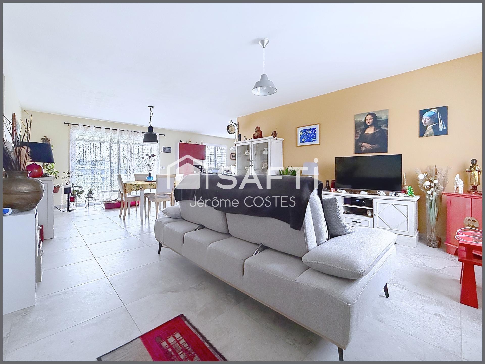 Vous découvrirez une belle pièce de vie lumineuse comprenant séjour, salle à manger et cuisine ouverte moderne, idéale pour partager des moments conviviaux en famille.