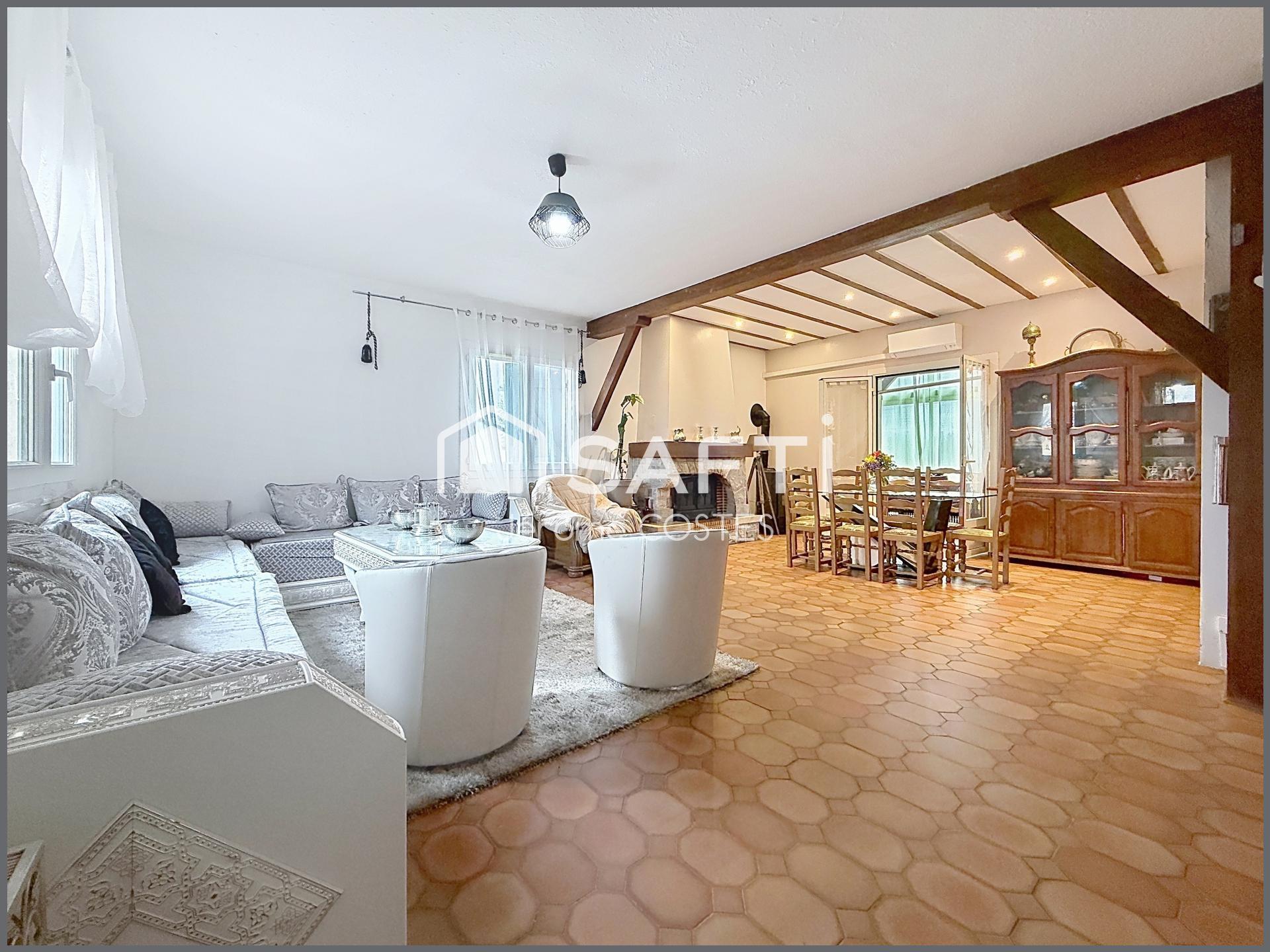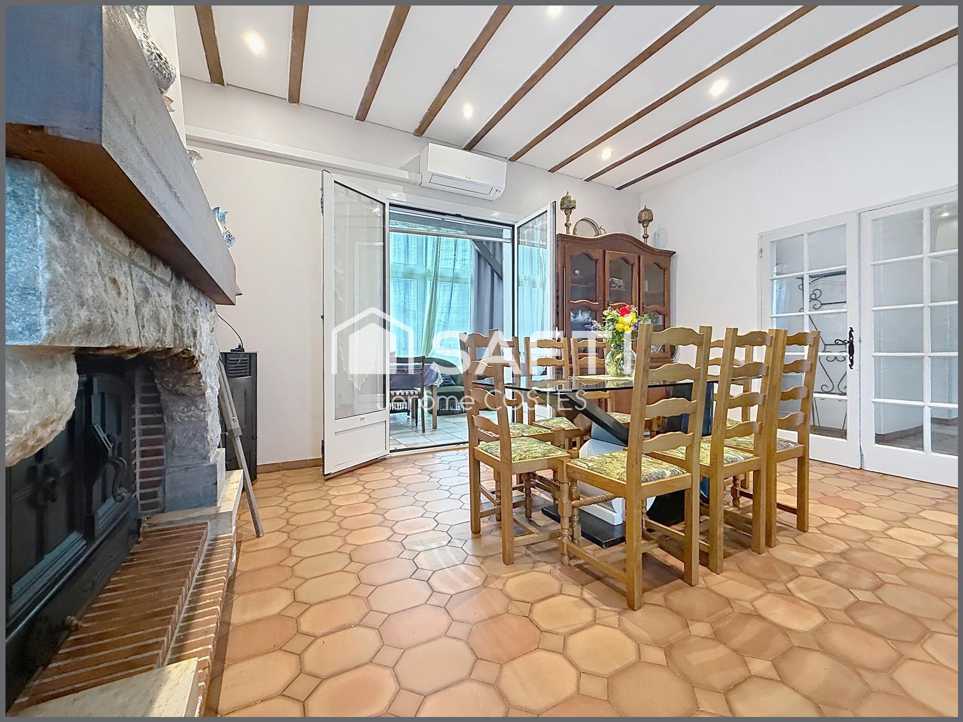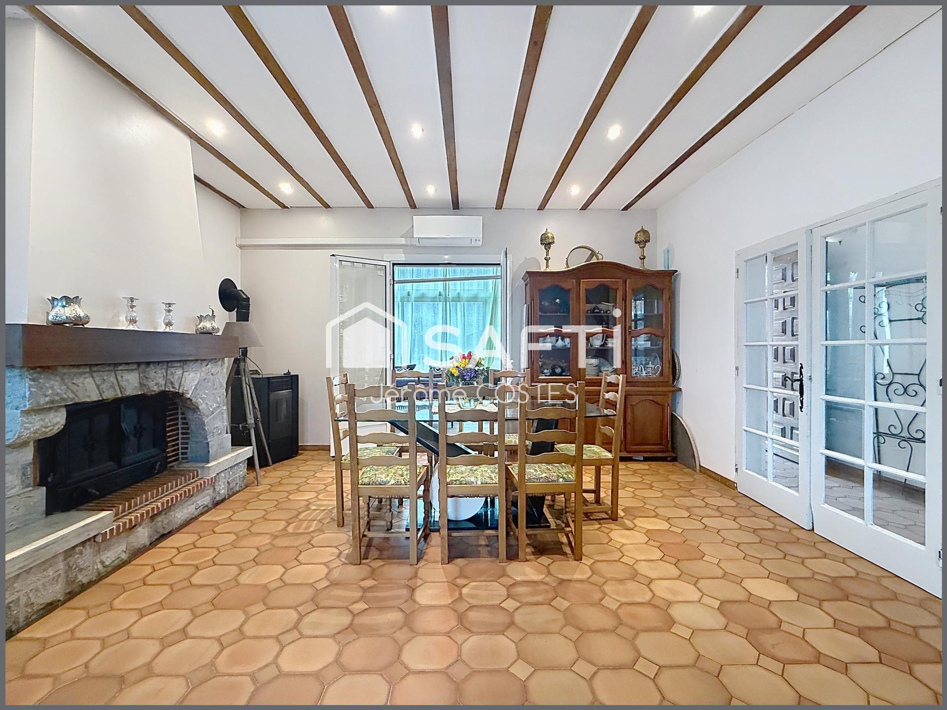 Le cœur de la maison s’articule autour d’un remarquable espace de vie de 50 m², réunissant séjour et salle à manger, baigné de lumière et sublimé par la présence d’un insert, apportant une atmosphère chaleureuse et conviviale.
