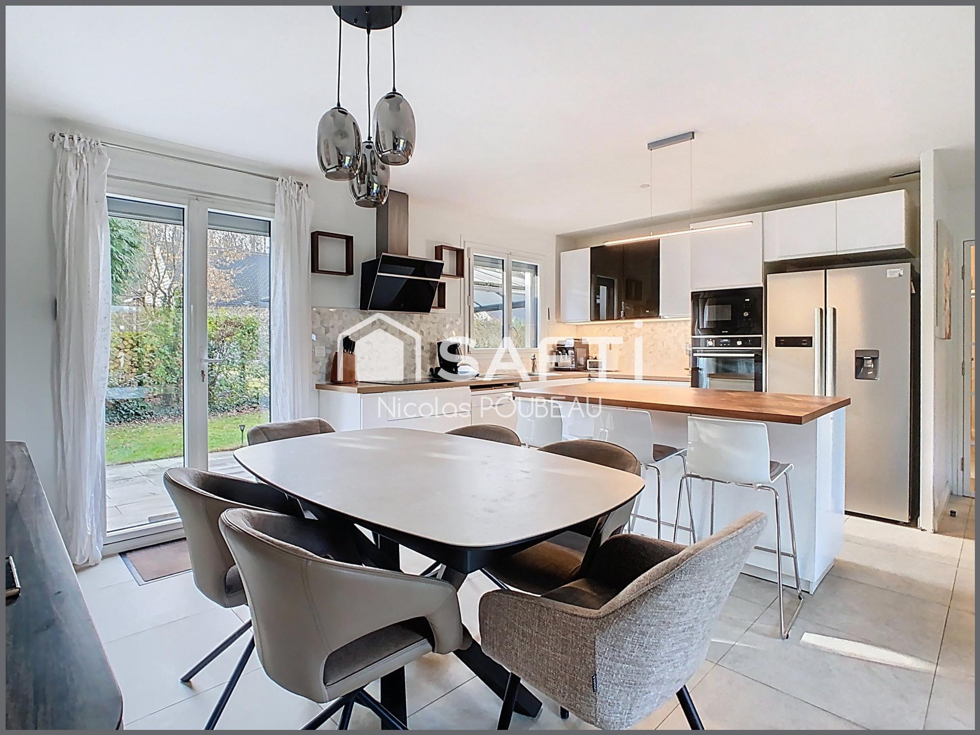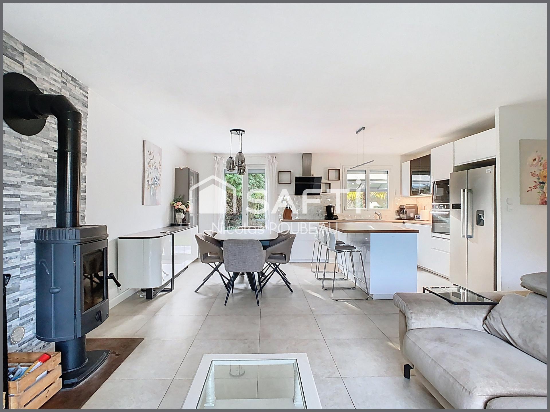 Au calme d'une impasse, proche de toutes les commodités à pied ( commerces, écoles, collège, bus, etc), venez découvrir ce charmant plain-pied total de 111 m2. Il vous offre une entrée avec placard, un séjour lumineux avec poêle à bois, une cuisine ouverte aménagée et équipée avec ilot central, une suite parentale avec dressing et salle de bains privative, 2 chambres avec placard, un bureau ou petite chambre avec placard, une salle d'eau avec wc et un cellier avec placard. Garage attenant à la maison avec son espace buanderie. Grenier aménageable sur l'ensemble de la maison. Vous profitez également d'une terrasse sous porche côté entrée et d'une autre terrasse sous pergola coté jardin, d'un bucher, de 2 cabanons pour le stockage, d'une cabane et d'un portique pour enfants et d'une belle parcelle de 856 m2 arborée et ensoleillée sans vis à vis. Stationnements possibles pour plusieurs véhicules devant la maison.