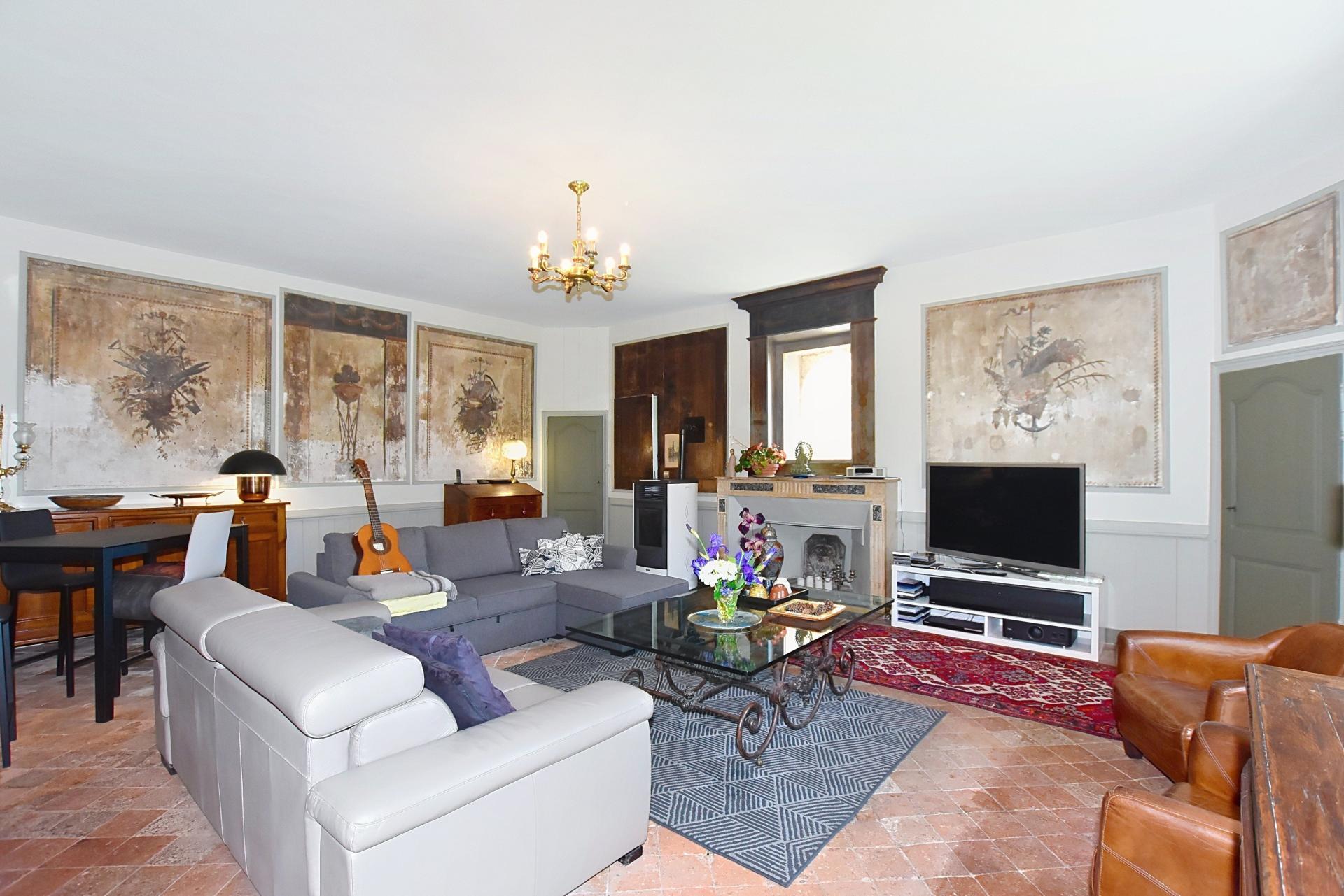 Une vaste cuisine dinatoire lumineuse, un salon chaleureux avec tomettes anciennes, cheminée d’époque et fresques restaurées, ainsi qu’un espace aménagé dans la tour, idéal en bureau, salon de lecture ou chambre supplémentaire avec vue imprenable.