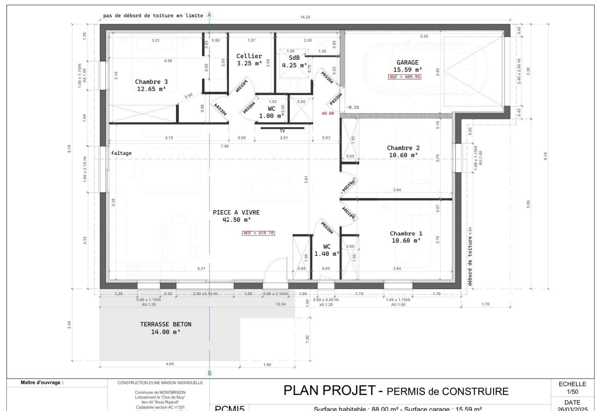Cette maison séduit par sa surface habitable de 88 m² sur un terrain de 403 m² entièrement clos, comprenant un garage de 15.5 m² et deux places de parking. Dotée d'un bel espace de vie, de 3 chambres, un cellier, salle d'eau et toilette. Elle offre un espace extérieur agréable avec une terrasse pour des moments de détente en famille ou entre amis.