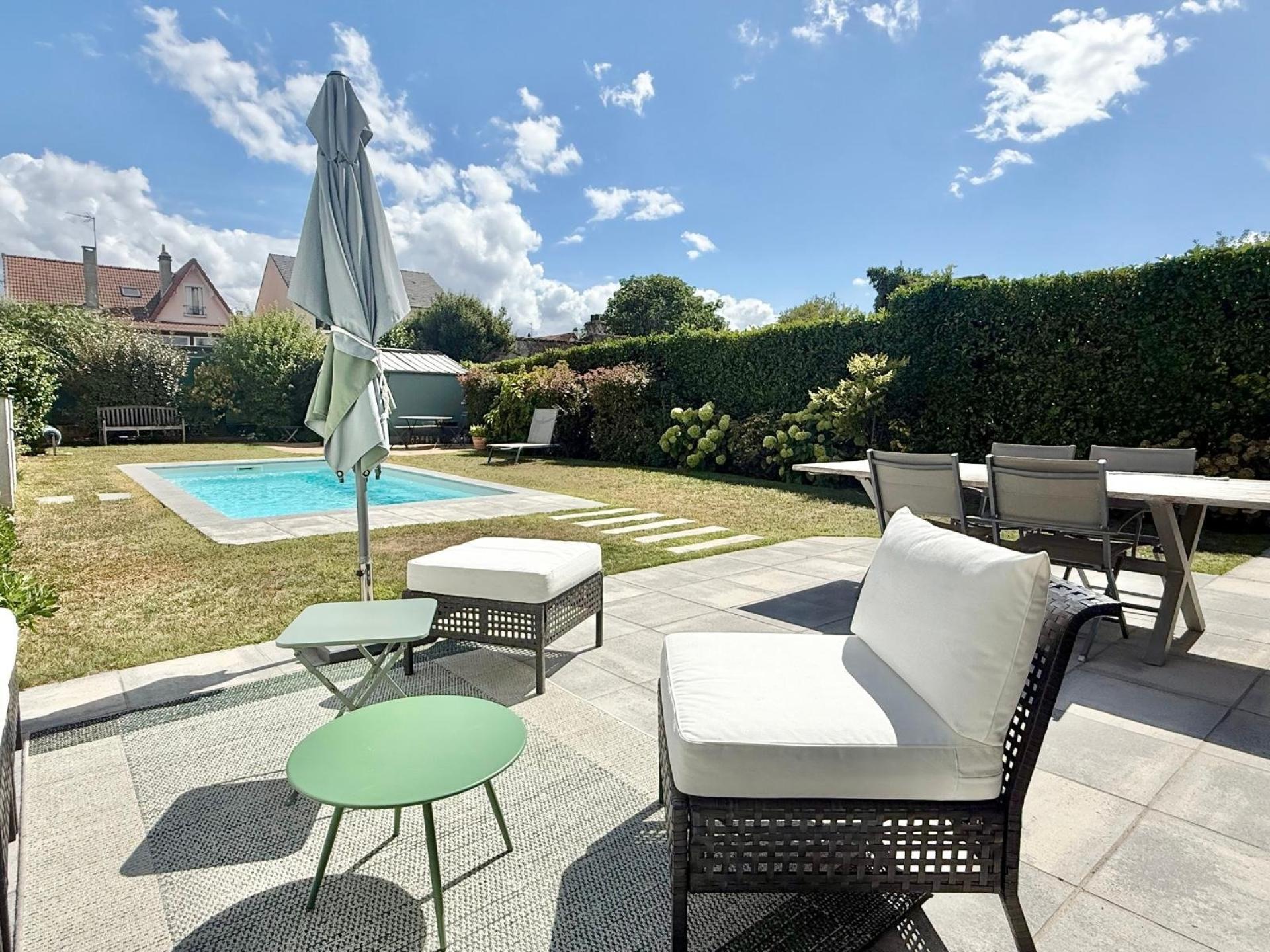 Les extérieurs offrent une piscine, un abri de jardin et une exposition sud pour profiter pleinement des beaux jours.