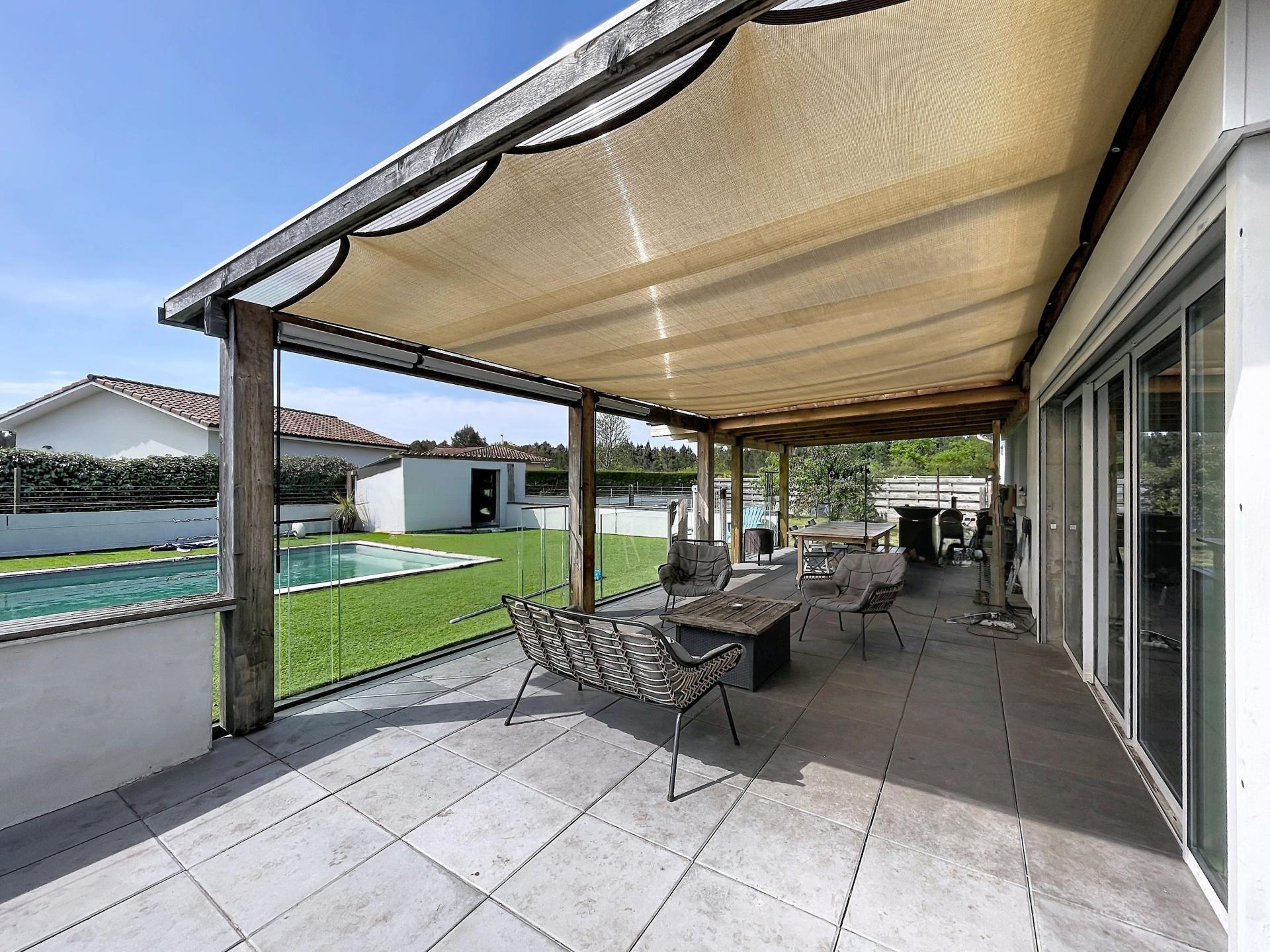 À l'extérieur, la propriété s'étend sur un terrain de 1534m² idéalement agencé. Avec son orientation ouest, sa magnifique terrasse de 55m2 et sa piscine sécurisée, les espaces extérieurs offrent des moments de détente ensoleillés idéaux.