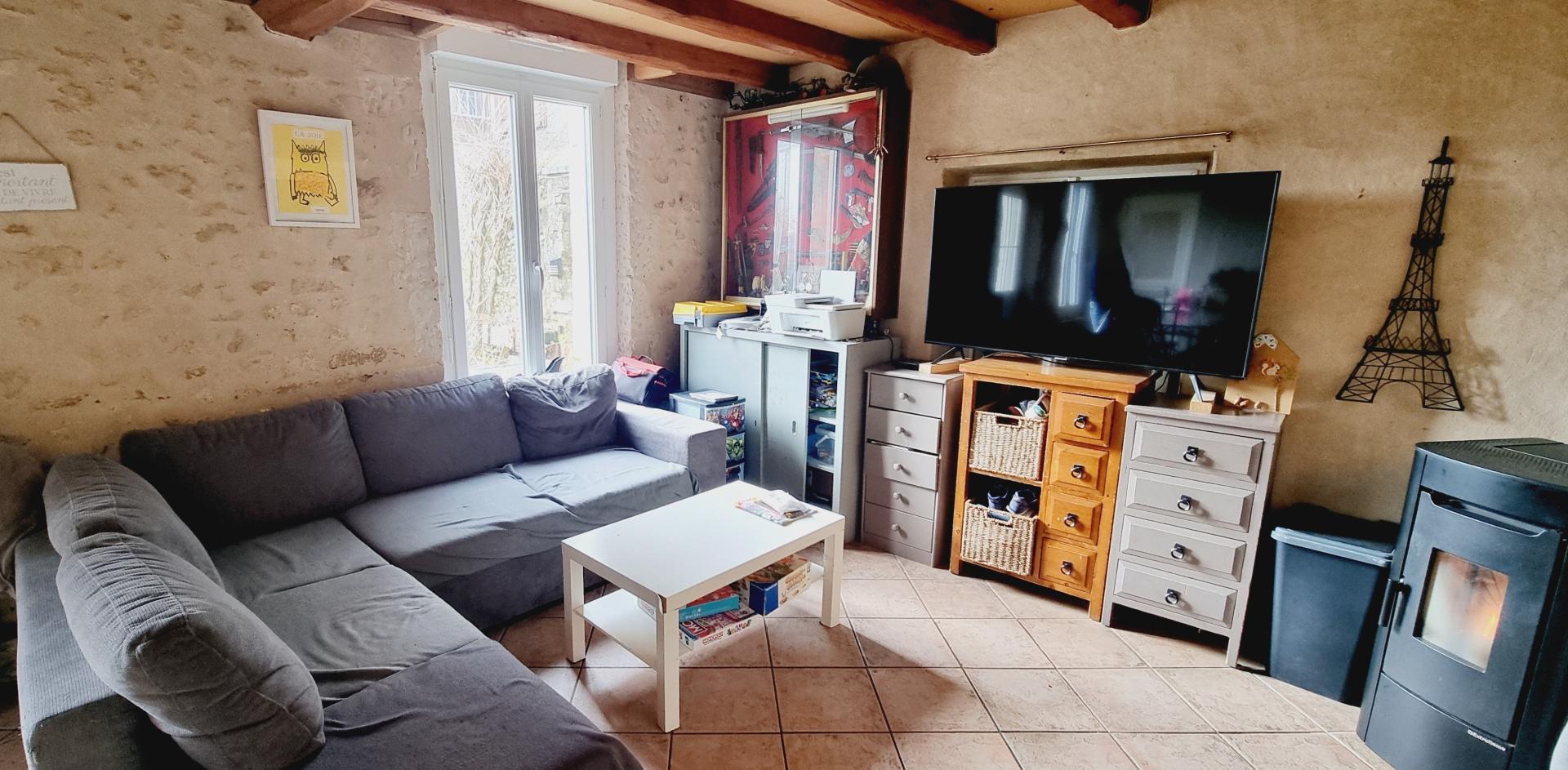 RdC : vaste pièce de vie avec poêle à granulés, cuisine, WC, buanderie, bureau de 30m² actuellement à usage de local commercial avec vitrine