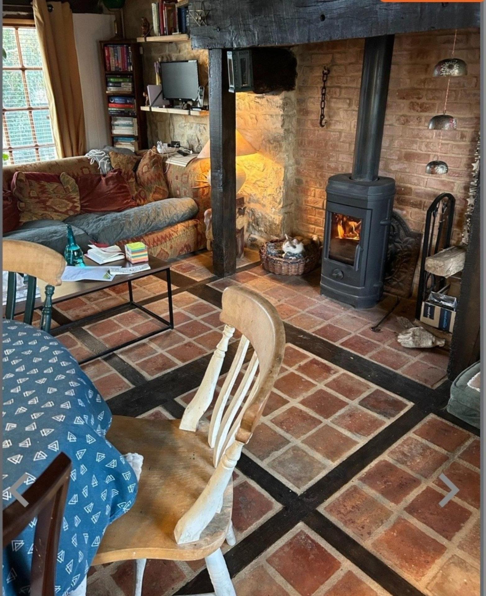 Seconde Maison – Colombages, cheminée d’origine, poêle à bois, cuisine, séjour, chambre, salle de bain, buanderie, jardin, allée.