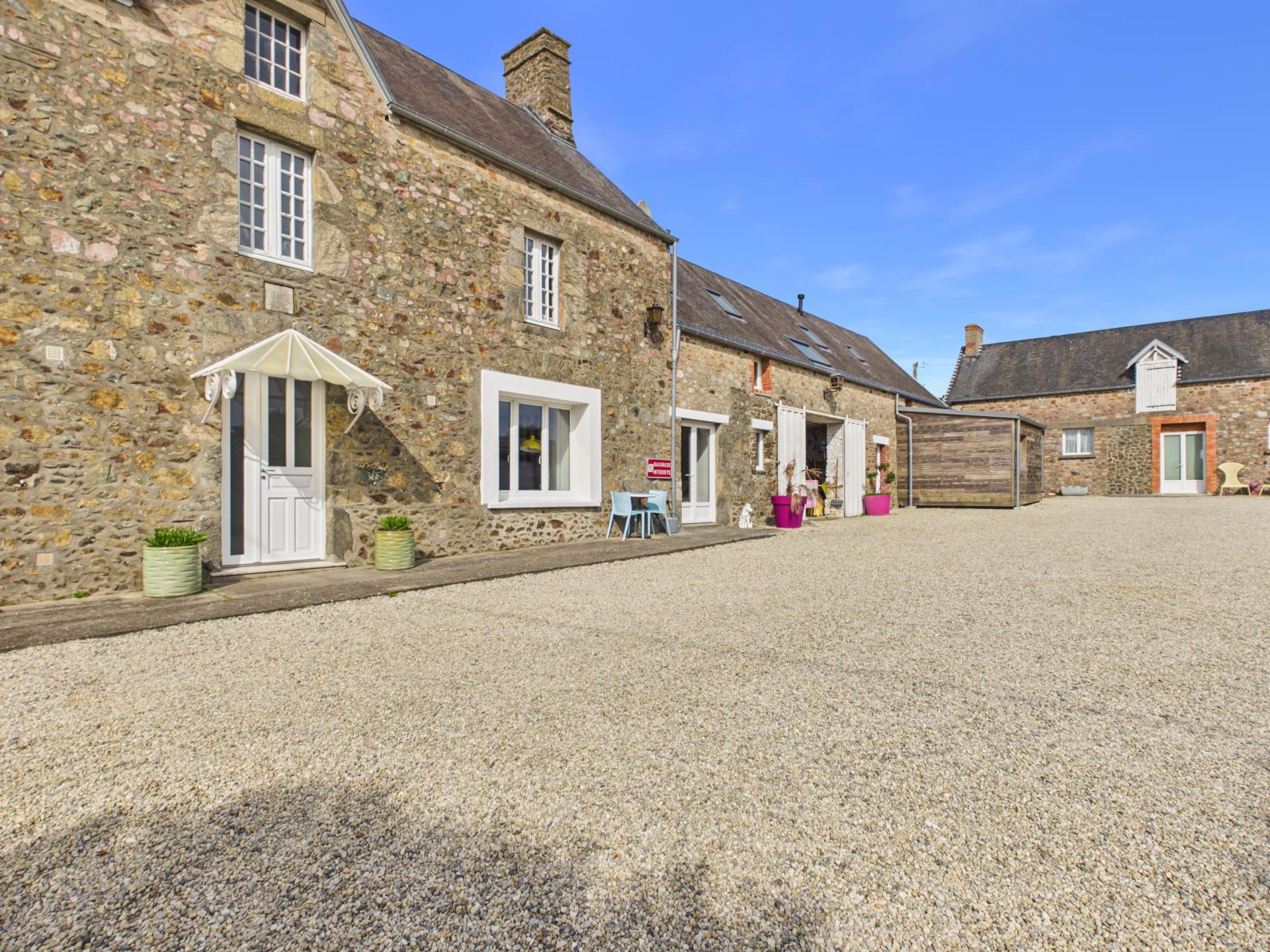 Ensemble immobilier composé d’une maison principale, d’une maison secondaire jouxtée à la maison principale, à finir d’aménager, un institut / bureau, un studio et une autre annexe servant de salle de sport, avec de nombreux garages / dépendances. Le tout sur une surface totale d’env. 341 m² sur un beau terrain de 4412 m², situé à Muneville-le-Bingard.