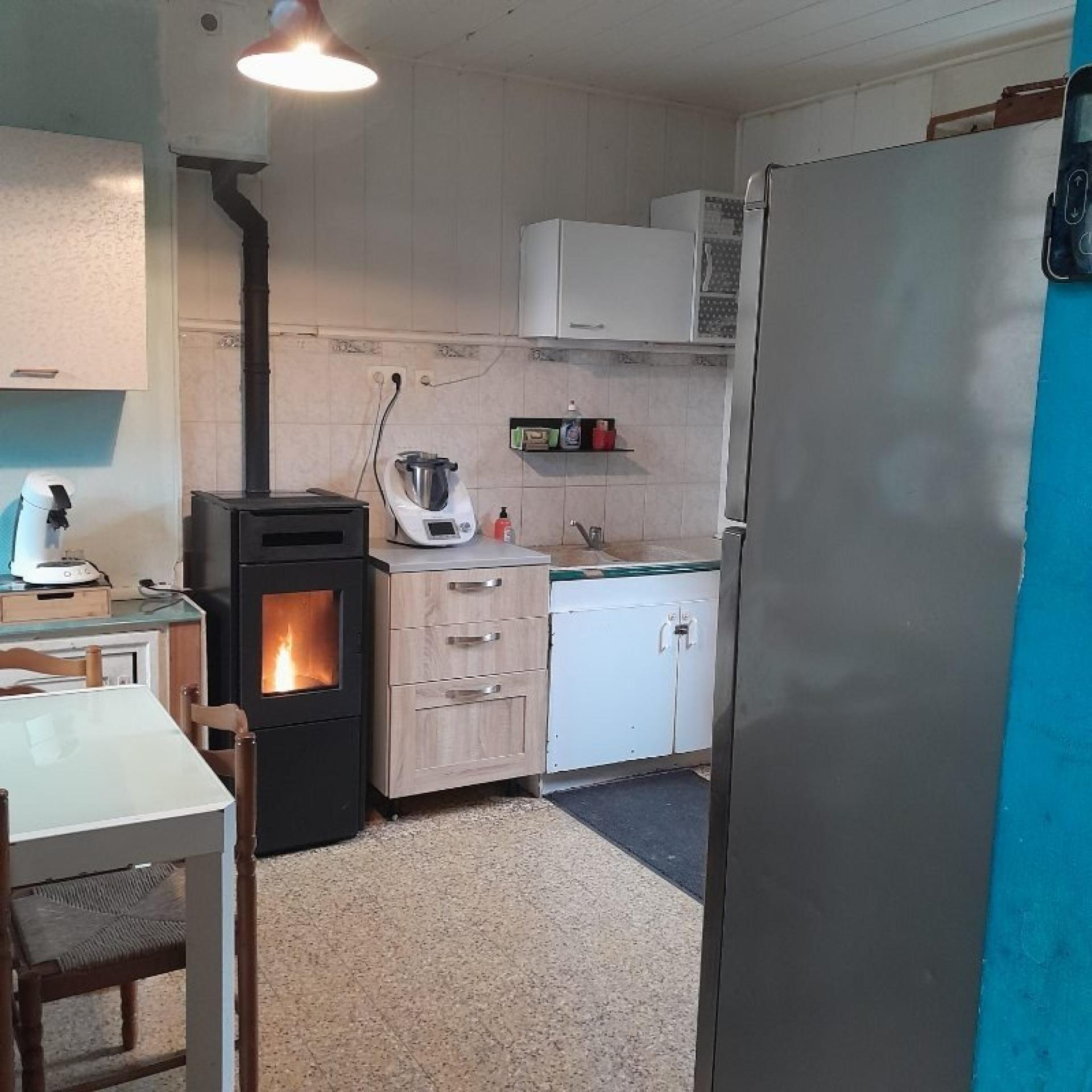 106 m², terrain 660 m², poêle + insert, 2 ch + bureau, jardin/terrasse, hangar pour voitures, combles aménageables aisément .