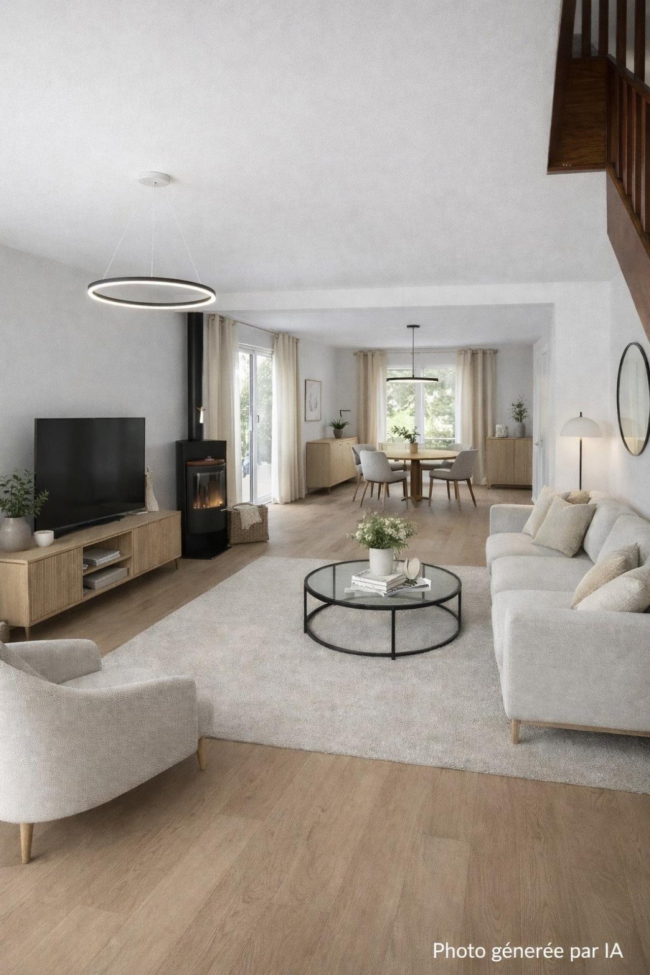 Dès l'entrée, la maison dévoile une belle pièce de vie lumineuse sublimée par la présence d'un poêle, apportant chaleur et convivialité à cet espace central. La cuisine fonctionnelle et harmonieuse, s'intègre parfaitement à l'ensemble. Au RDC, un bureau idéal pour le télétravail ou un espace dédié selon vos besoins avec une salle d'eau et wc indépendant.