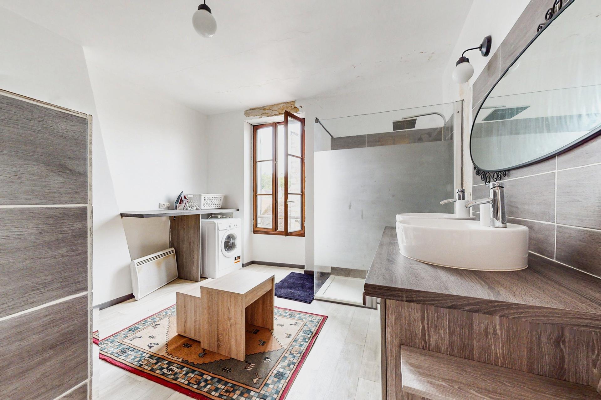À l’étage, vous trouverez une grande chambre ainsi qu’une vaste salle de bains équipée d’une baignoire, d’une douche à l’italienne et d’un double vasque. Cet espace généreux permet aussi d’accueillir une buanderie.