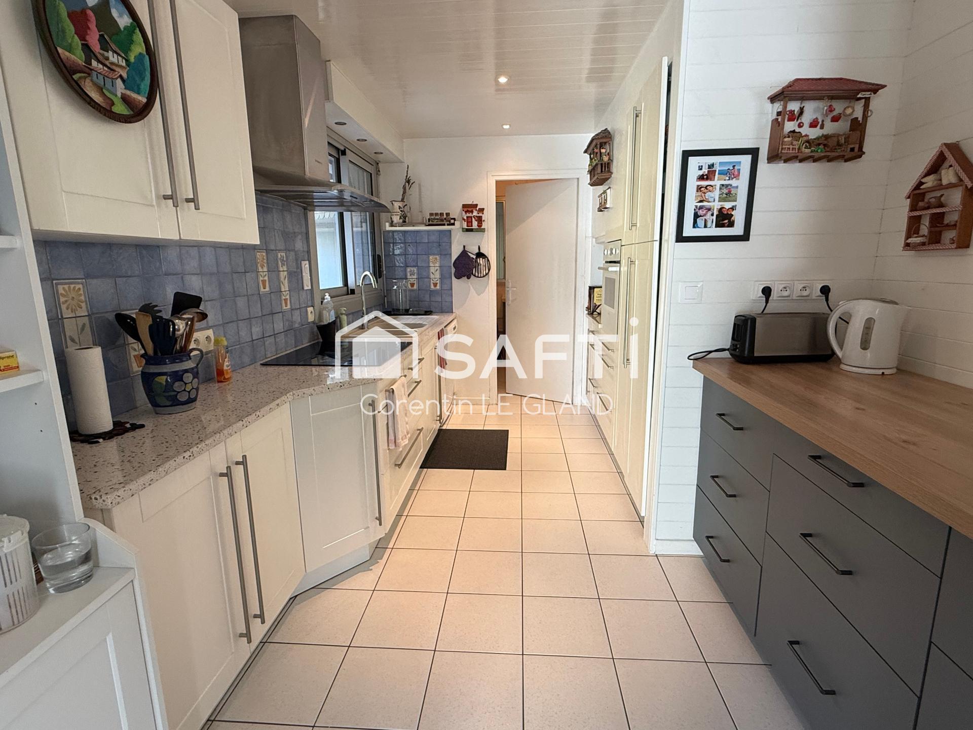 À l’intérieur, le rez-de-chaussée propose un séjour-salon lumineux avec cheminée insert, une cuisine équipée, une arrière-cuisine, trois chambres, une salle d’eau avec WC, un WC indépendant, un bureau, une grande salle de jeux, une véranda et un double garage. À l’étage, une belle mezzanine, deux chambres, un bureau, une salle d’eau et un WC indépendant. Une grande cave en sous-sol complètent les prestations de ce bien