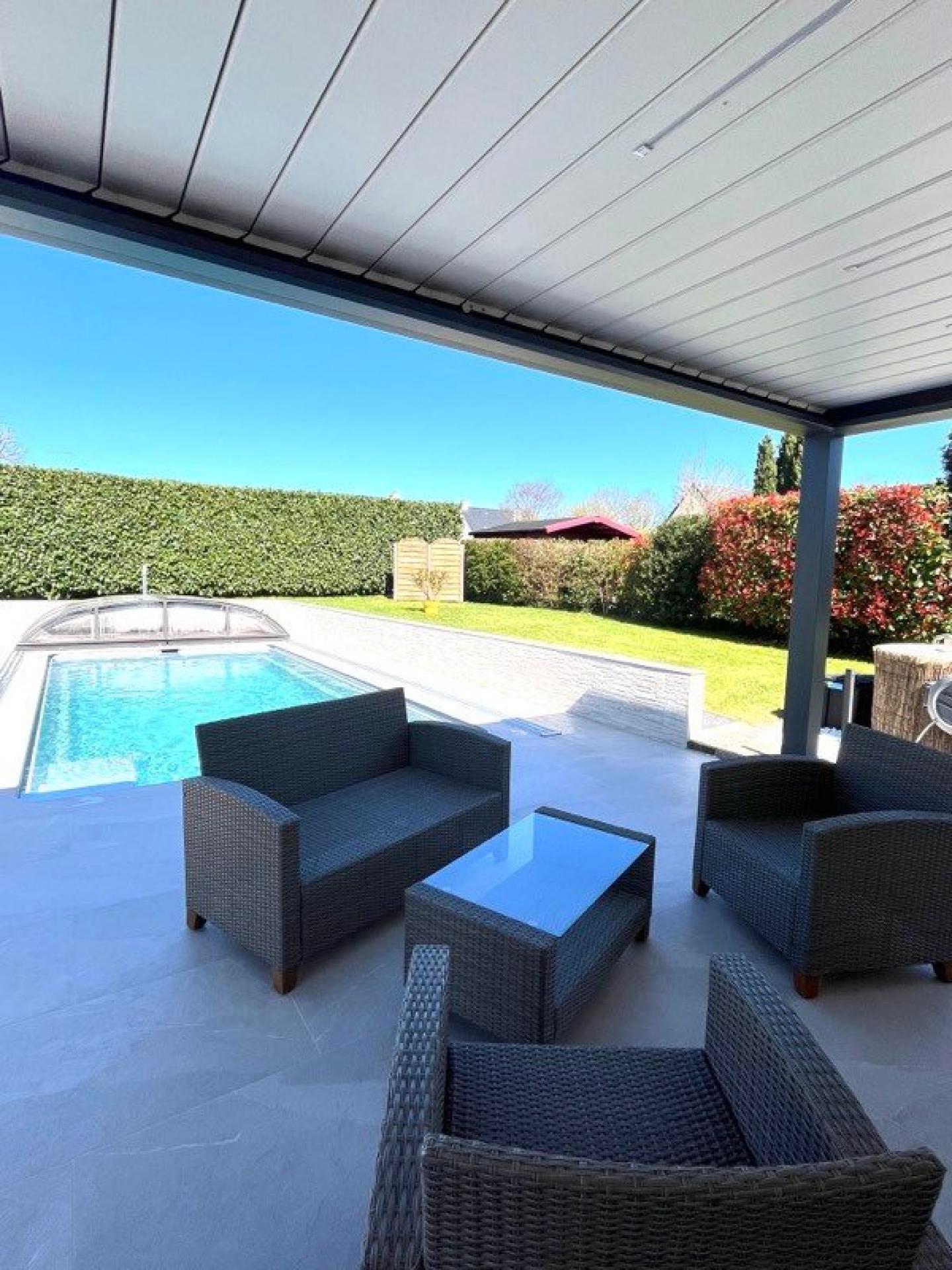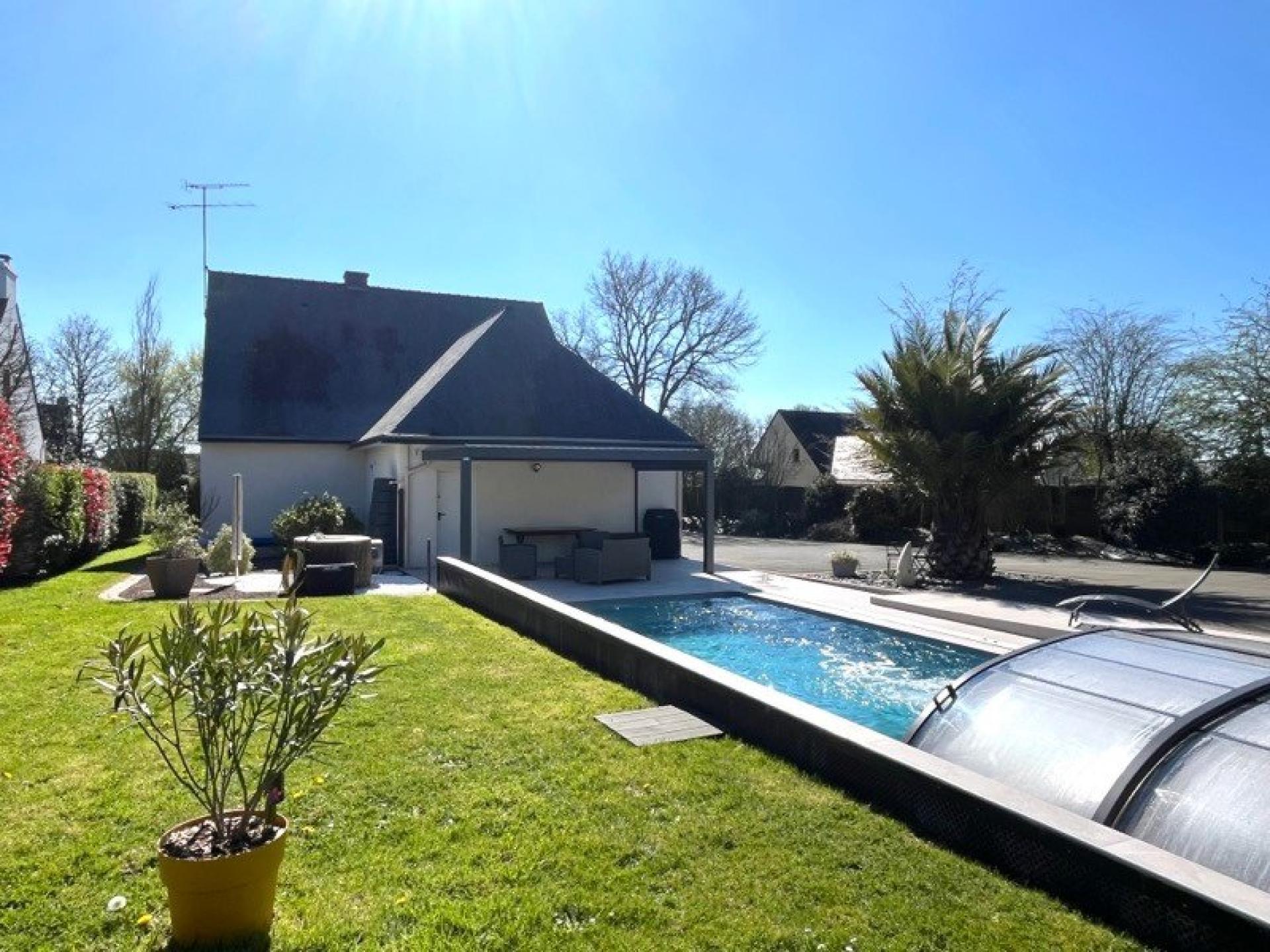 Très bel aménagement extérieur avec piscine chauffée, beaux volumes, 2 doubles garages, possibilité 5 chambres
