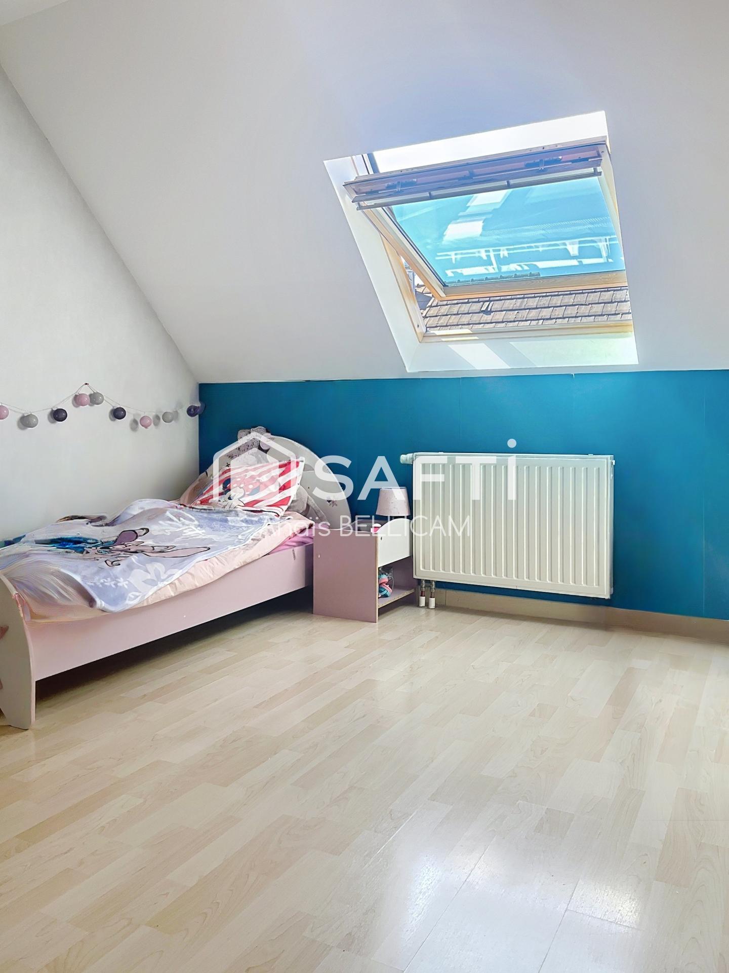 À l’étage, l’espace nuit se compose de quatre chambres confortables, toutes dotées de placards muraux intégrés, offrant praticité et rangement. Une salle de bains avec baignoire dotée d’un second WC complète ce niveau.