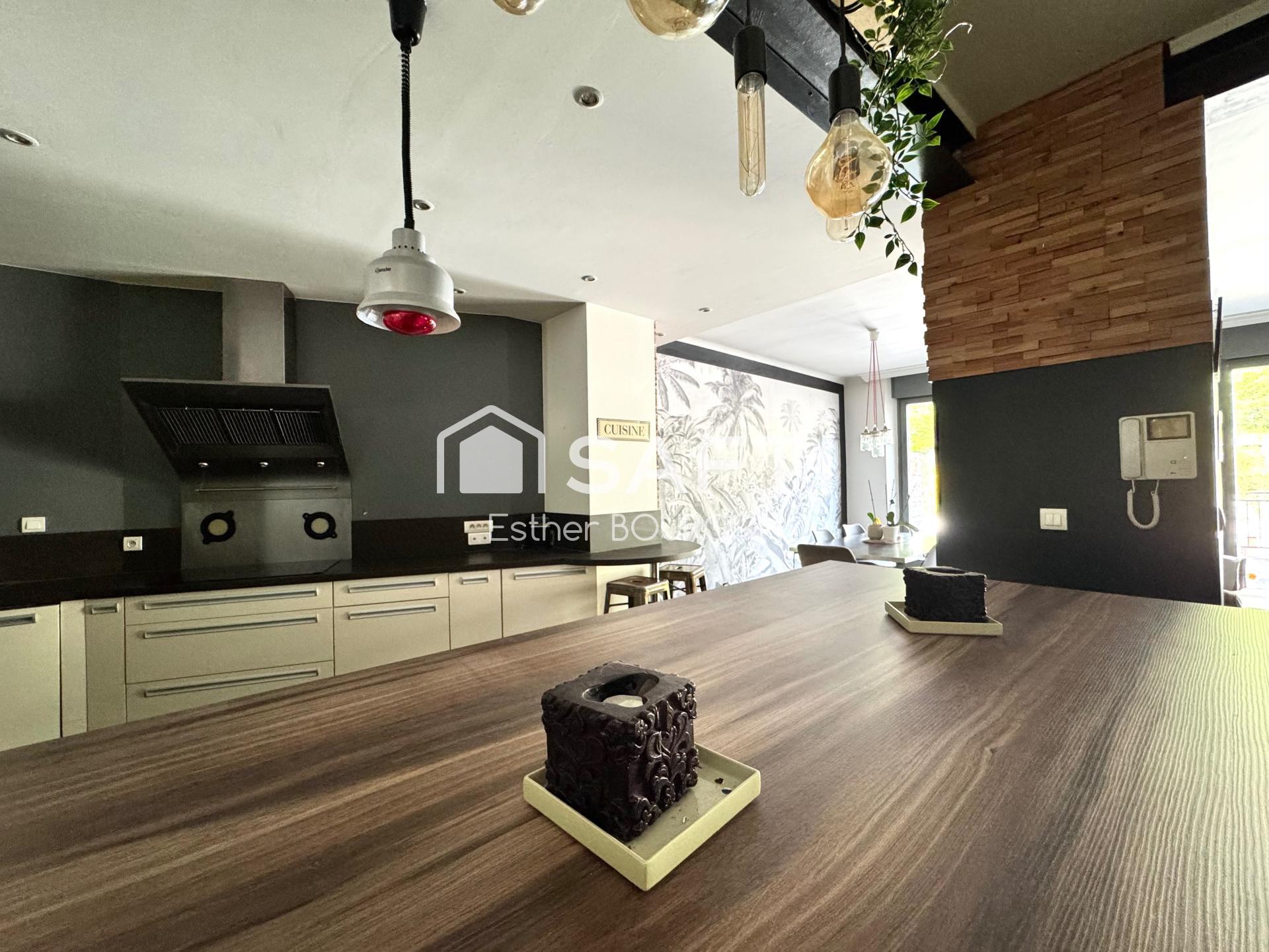 À l’étage, un élégant appartement familial dévoile une vaste pièce de vie baignée de lumière avec poêle à bois, cuisine ouverte et accès terrasse. L’espace nuit comprend quatre chambres, dont une suite parentale, ainsi qu'une salle de bains.