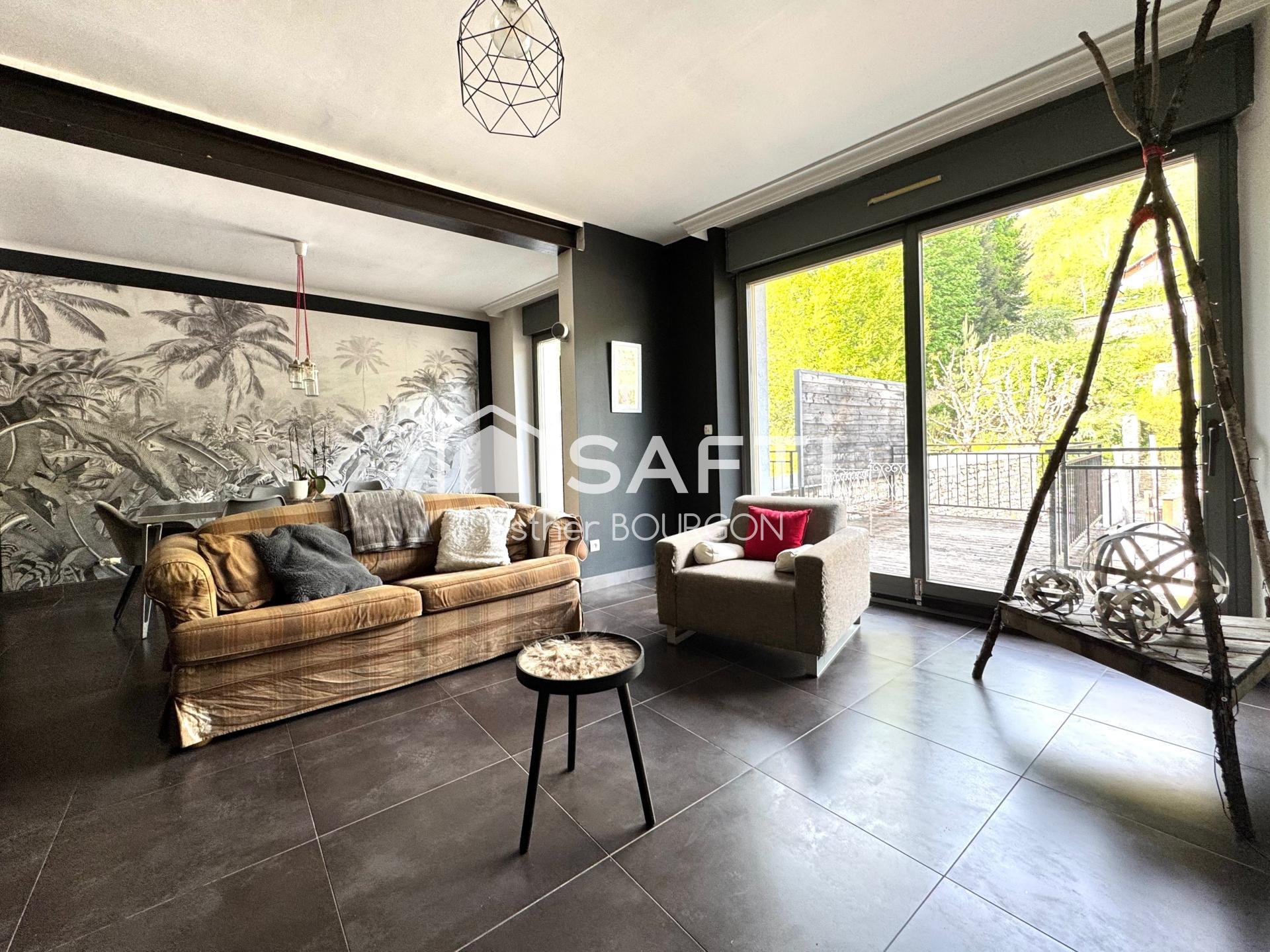 Vue sur les roches d’Ornans, grand terrain avec piscine, espace pro au RDC, 4 chambres, terrasse, volumes lumineux, cadre nature en ville