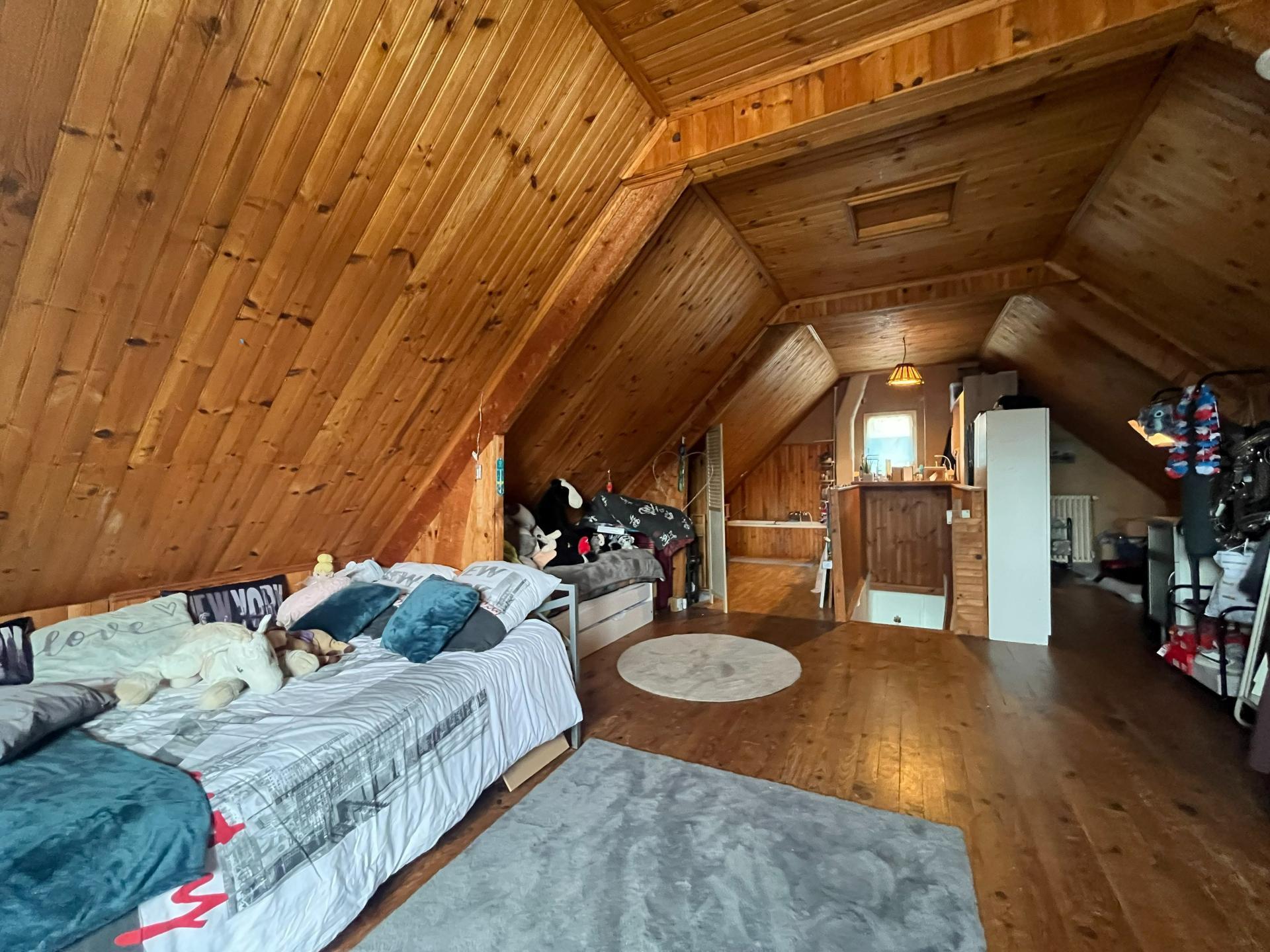 Grenier aménagé en grande chambre avec salle d’eau et WC. Possibilité d’aménager une troisième chambre selon vos besoins.