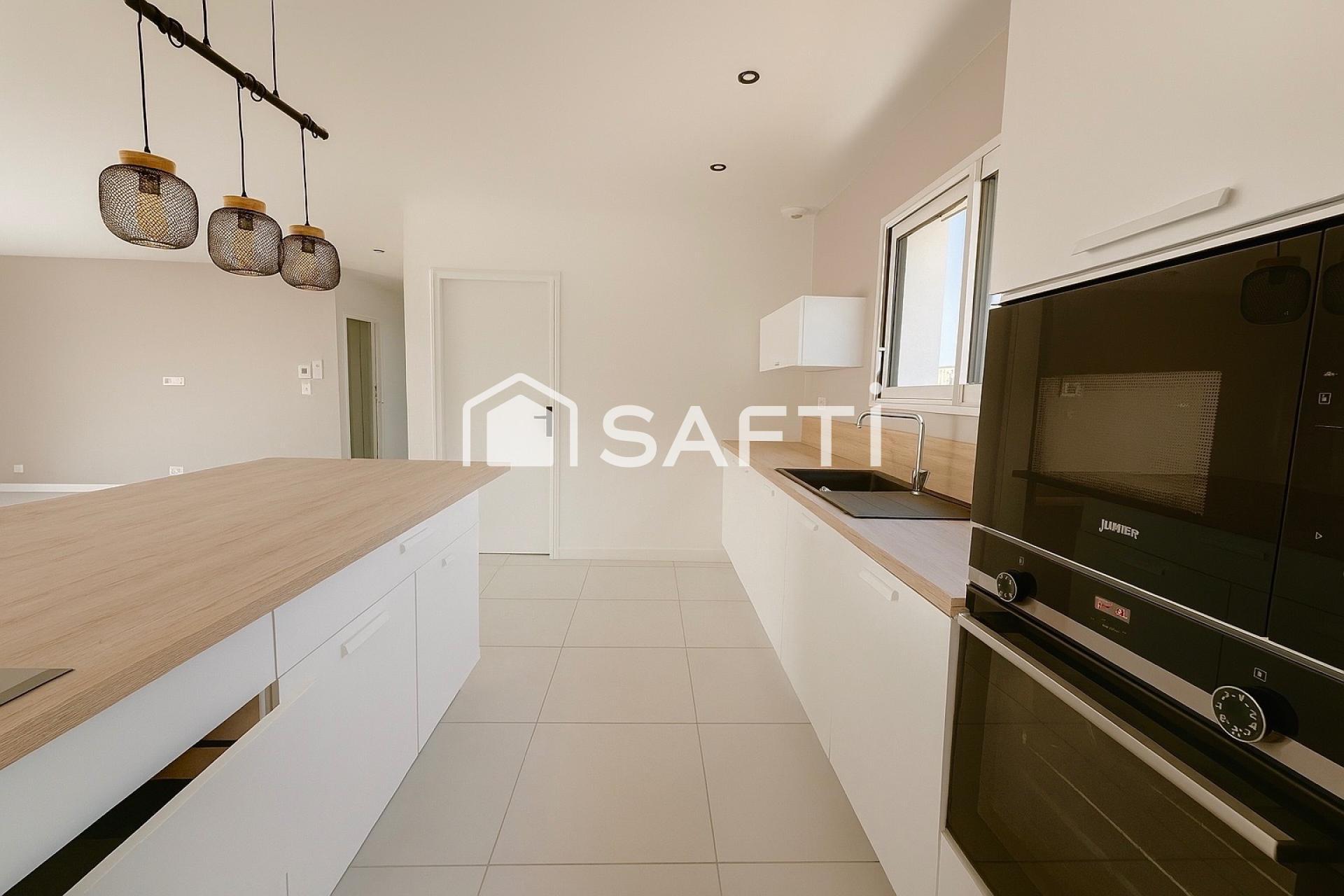 Implantée dans un lotissement récent et harmonieux, la villa bénéficie d’un cadre de vie serein et d’un voisinage agréable, à deux pas des commodités. Conçue avec une architecture actuelle et baignée de lumière naturelle, elle offre un vaste espace de vie avec cuisine ouverte, entièrement aménagée et équipée (marque Ixina), prolongeant naturellement sur la terrasse et l’espace baignade.