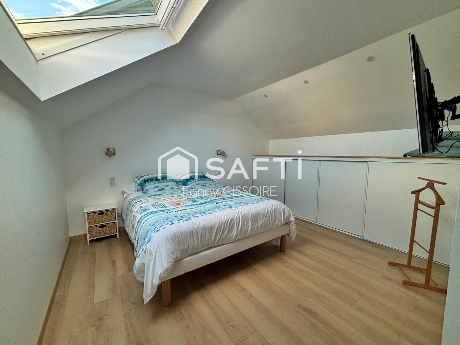 À l’étage, l’espace nuit comprend deux chambres spacieuses avec rangements, une salle d’eau et des WC séparés.