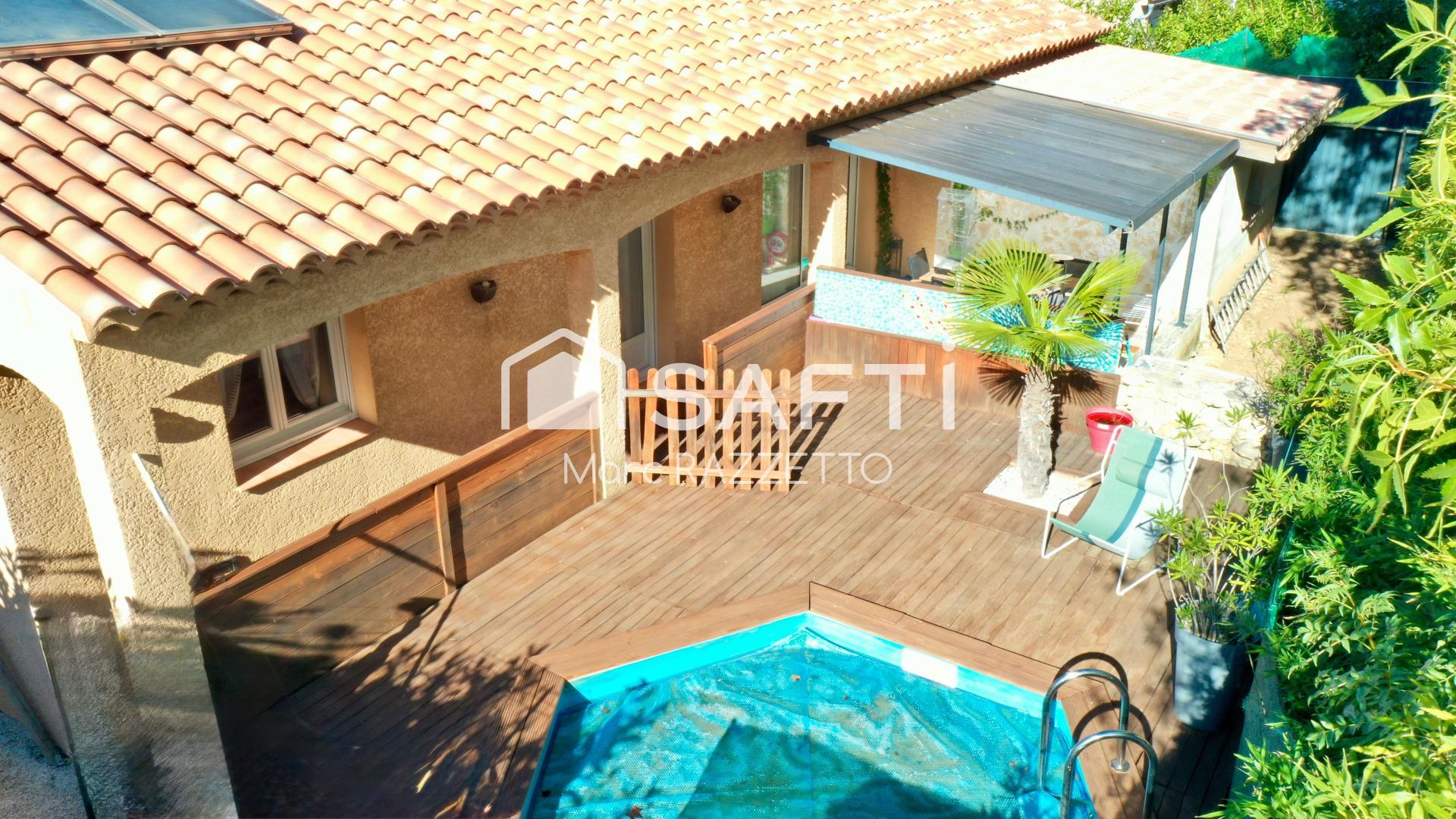 A Peyrolles en Provence - Proche de toutes les commodités (bus, écoles et commerces), non loin du centre ville, au calme, jolie maison T4/T5 de 116,17m2 sur 466m2 de terrain avec piscine (local technique), elle se compose d'un hall d'entrée avec sas et placard, d'un grand séjour de 50m2 environ avec une belle cuisine ouverte aménagée et équipée, avec accès au jardin avec sa piscine et sa terrasse bois. Le coin nuit dispose de 3 chambres dont une avec salle de bain, une avec salle d'eau (douche italienne) et wc, une autre avec dressing pouvant faire office de bureau, chambre d'amis ou d'enfant de 10,77m2. Un WC indépendant, un grand garage de 25m2 avec porte automatique, la maison dispose aussi de nombreuse places de parking extérieurs (4 minimum). Le jardin paysagé et sa piscine avec 25m2 de terrasse dispose également d'un abris de jardin sur dalle, d'arbres fruitiers (cerisier, olivier). Climatisée, 2 panneaux solaires sur le toit pour l'eau chaude.