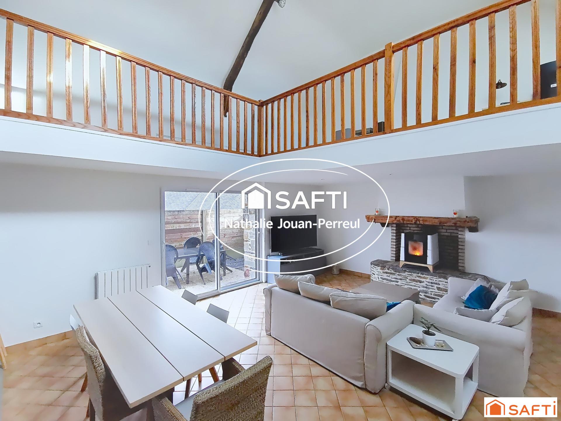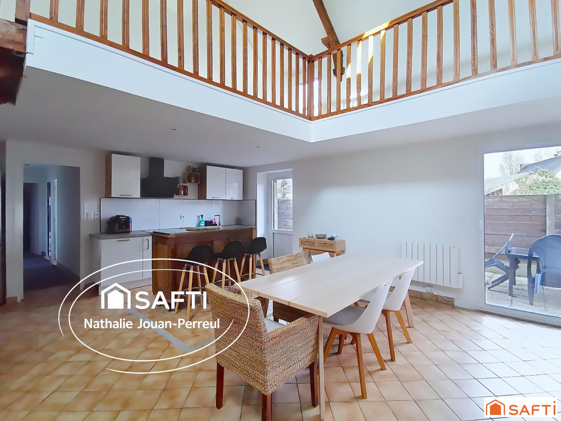 À l’intérieur, vous profitez d’une cuisine aménagée ouverte sur un salon-séjour chaleureux, équipé d’un poêle à pellets et d’un déstratificateur ajustable selon la saison. Au rez-de-chaussée, vous trouverez également deux chambres sur parquet avec poutres apparentes, une salle de bain, un WC séparé, une buanderie. A l’étage, vous y découvrirez une grande et lumineuse mezzanine pouvant être aménagée en chambre supplémentaire, un espace bureau, ainsi qu’une suite parentale avec sa salle d'eau privative et son dressing.