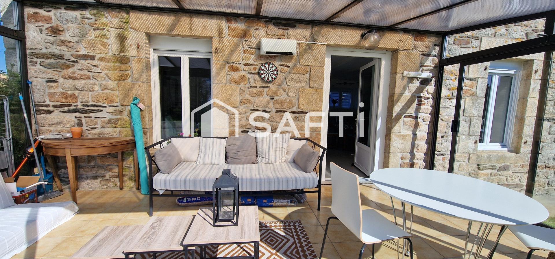 Cette maison en pierres sous ardoises, d'une surface habitable de 83 m², se compose de 4 pièces dont 3 chambres, 2 toilettes et 2 salles de bain. Une partie rénovée offre une grande véranda lumineuse en façade et abrite une cuisine équipée ouverte sur un salon/salle à manger avec poêle à granulés, une chambre et une salle d'eau.