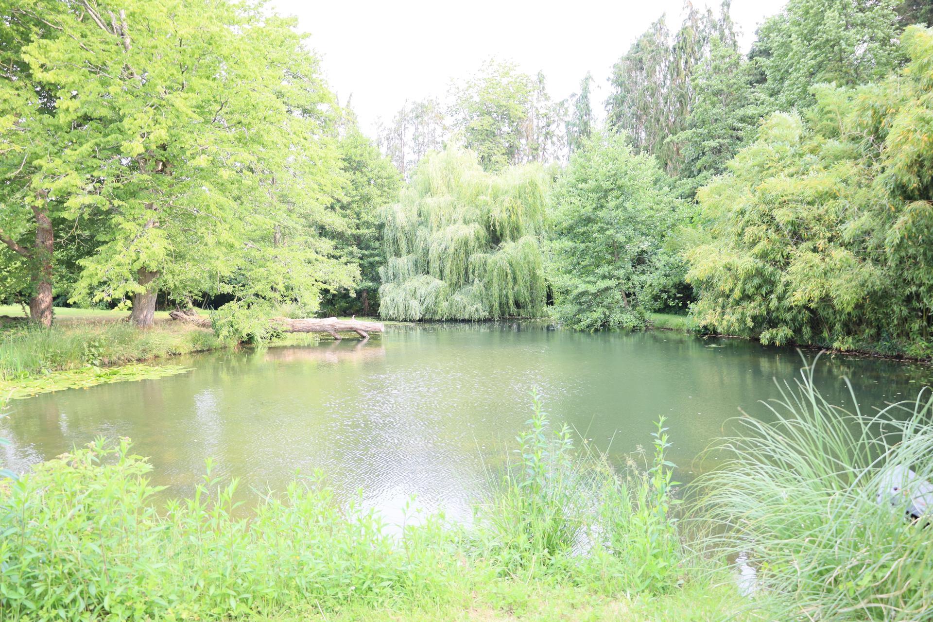 - au rez-de-chaussée : une spacieuse, chaleureuse et lumineuse pièce de vie (salon, salle à manger et cuisine) avec cheminée centrale motorisée donnant accès à la terrasse en châtaignier face à l'étang, une suite parentale avec salle d'eau et un wc séparé.