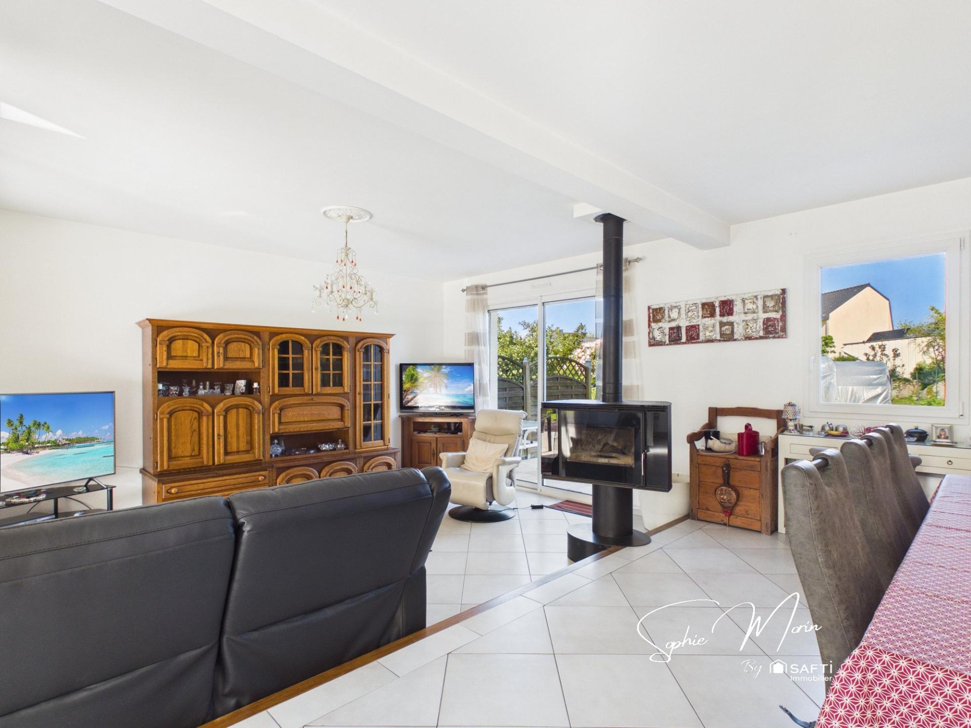 Édifiée sur un terrain de 1 359 m², elle offre une vaste pièce de vie de plus de 60 m², baignée de lumière, avec cuisine ouverte. Vous y trouverez également une chambre de plain-pied avec sa salle d’eau, une buanderie ainsi qu’un accès direct au garage.
