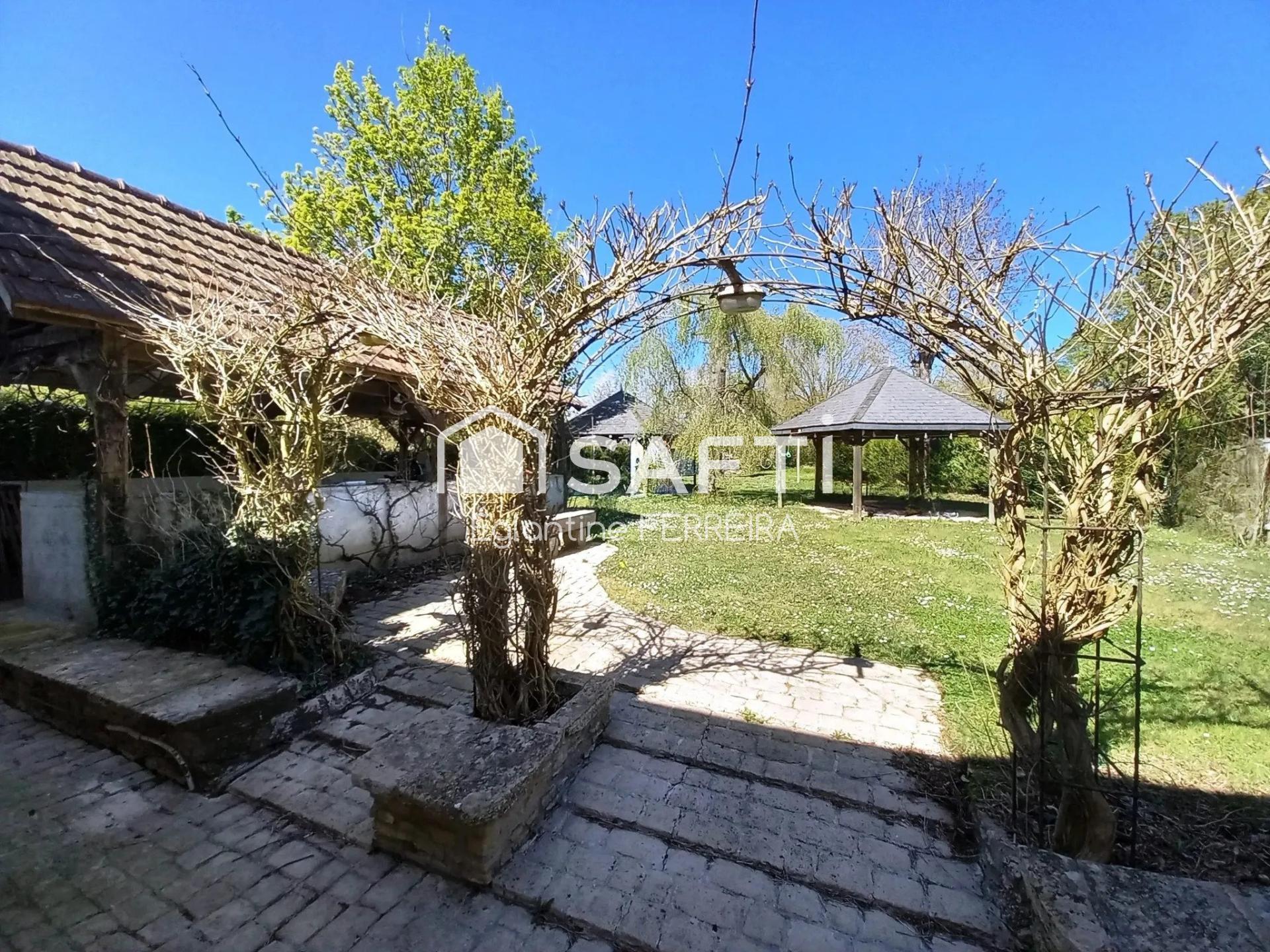 Le double garage de 45m² avec combles aménageables et les dépendances offrent un espace supplémentaire, le tout sur un terrain de 2749 m² avec cour gravillonnée, jardin arboré et kiosque.