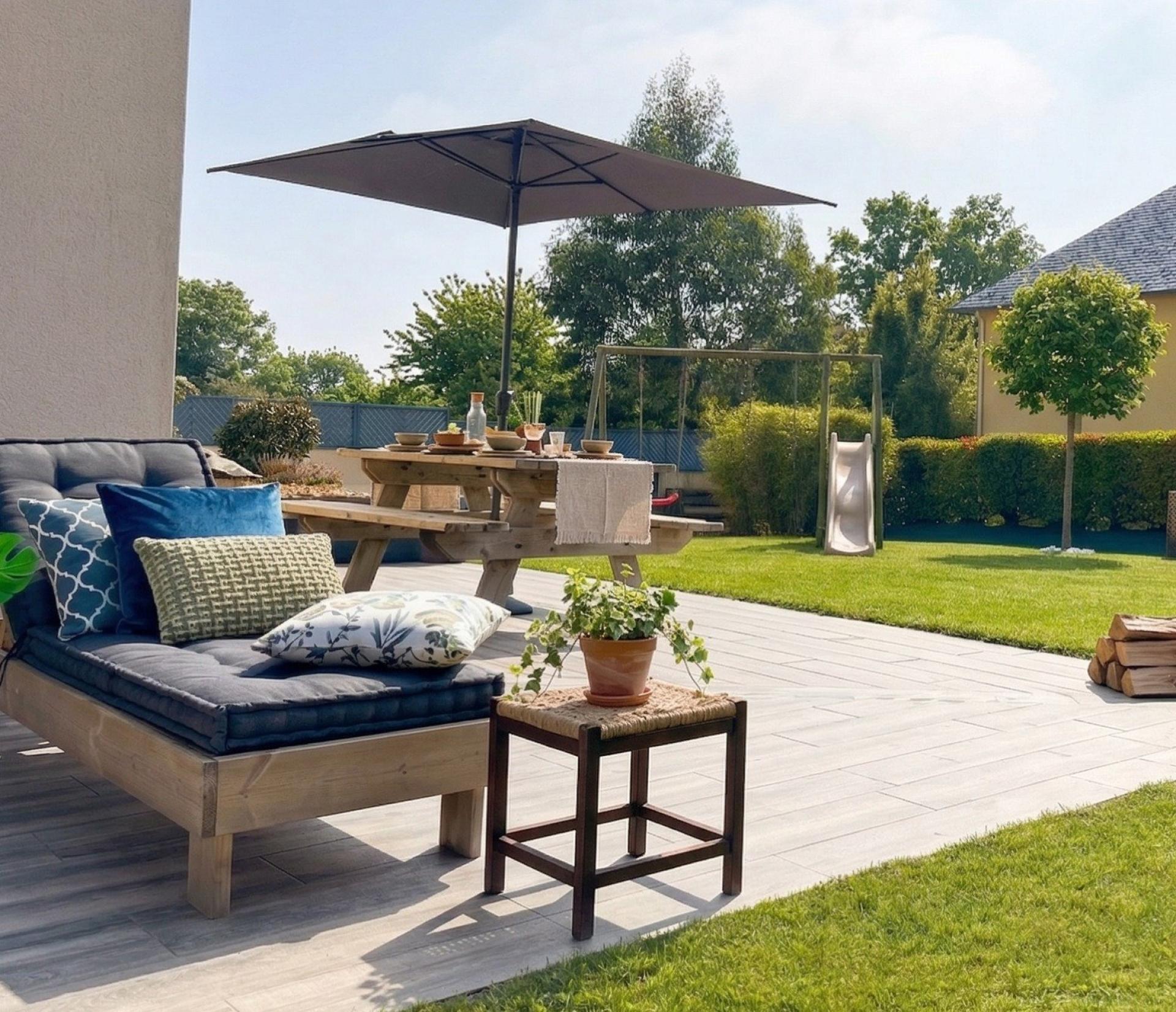 À l’extérieur, le jardin clos exposé sud-ouest invite à la détente et aux moments partagés : terrasse ensoleillée, barbecue en pierre, cabane en bois pour les enfants et abri à bois composent un ensemble harmonieux et fonctionnel.