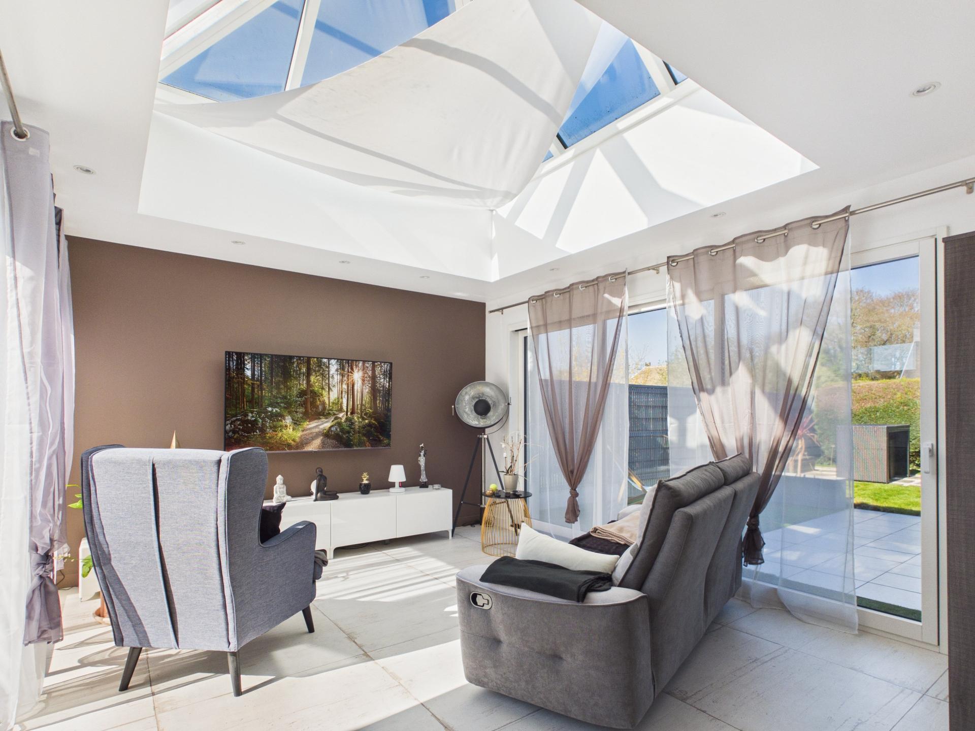Au rez-de-chaussée, vous découvrez un grand séjour-salon sublimé par un puits de lumière qui renforce la sensation d’espace et de clarté. Deux grandes baies vitrées, de part et d’autre du salon, prolongent naturellement la pièce de vie vers l’extérieur :