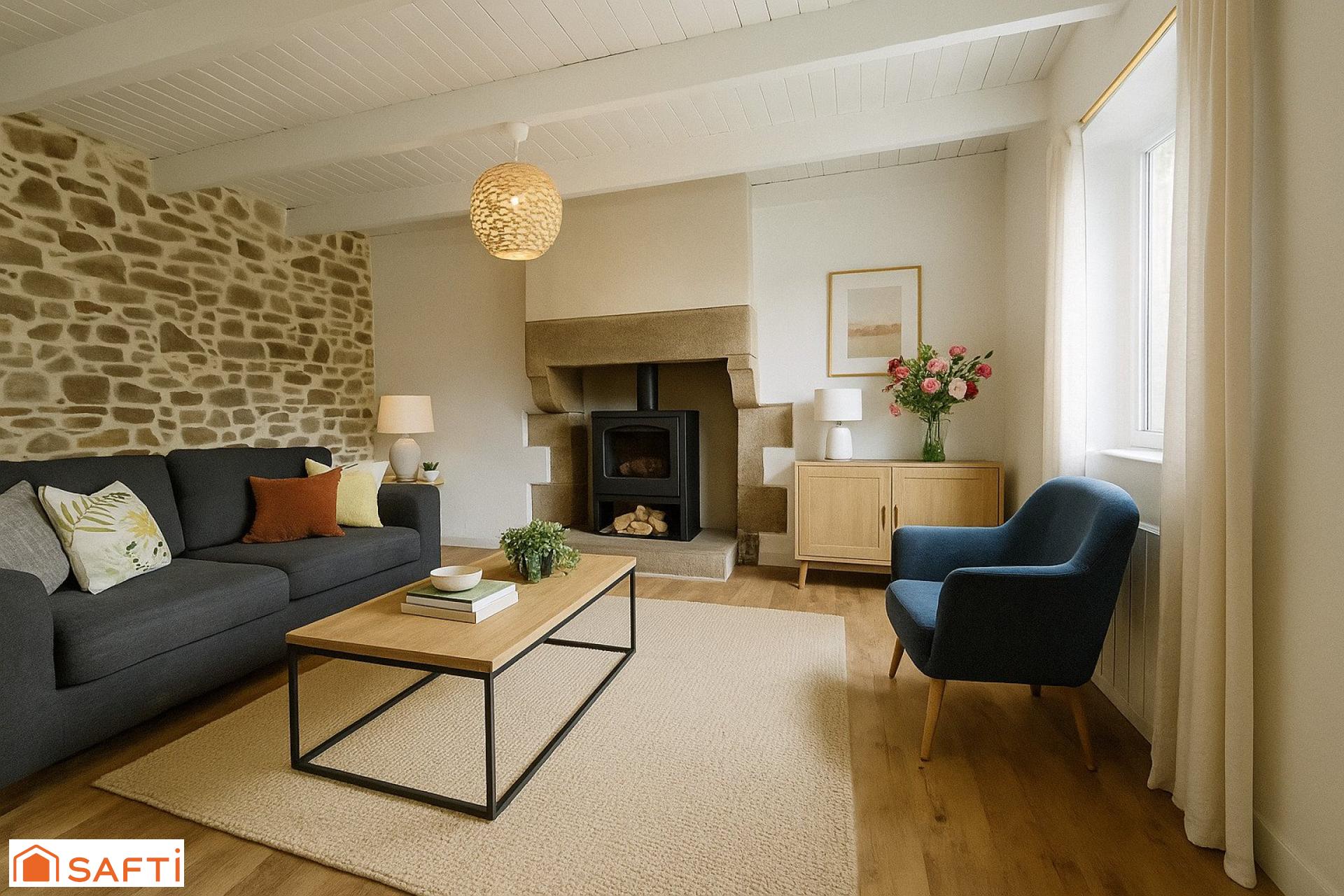 À l'intérieur, le rez-de-chaussée se compose d'une cuisine ouverte et équipée, d'un salon lumineux avec cheminée-insert, d'une chambre, d'une salle de bain et d'un toilette. À l'étage, un palier avec placard dessert deux grandes chambres. Chaque espace est optimisé pour offrir confort et fonctionnalité, créant ainsi un intérieur chaleureux et accueillant. Cette maison de 4 pièces et 3 chambres est idéale pour une famille en quête d'un foyer douillet dans un cadre bucolique en Bretagne.