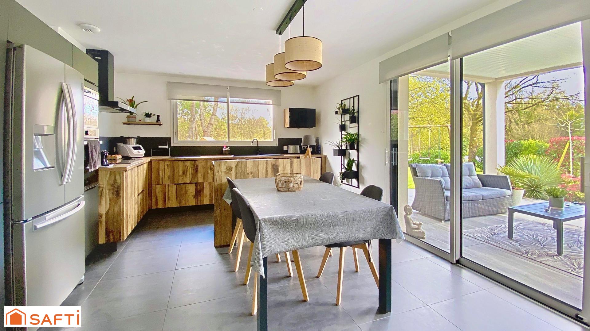 Dès les premiers pas, la lumière s’impose comme une évidence. La pièce de vie, spacieuse et chaleureuse, s’organise autour d’un poêle à bois qui promet de doux moments en toute saison. Ouverte sur cet espace convivial, la cuisine aménagée et équipée devient naturellement le cœur de la maison.