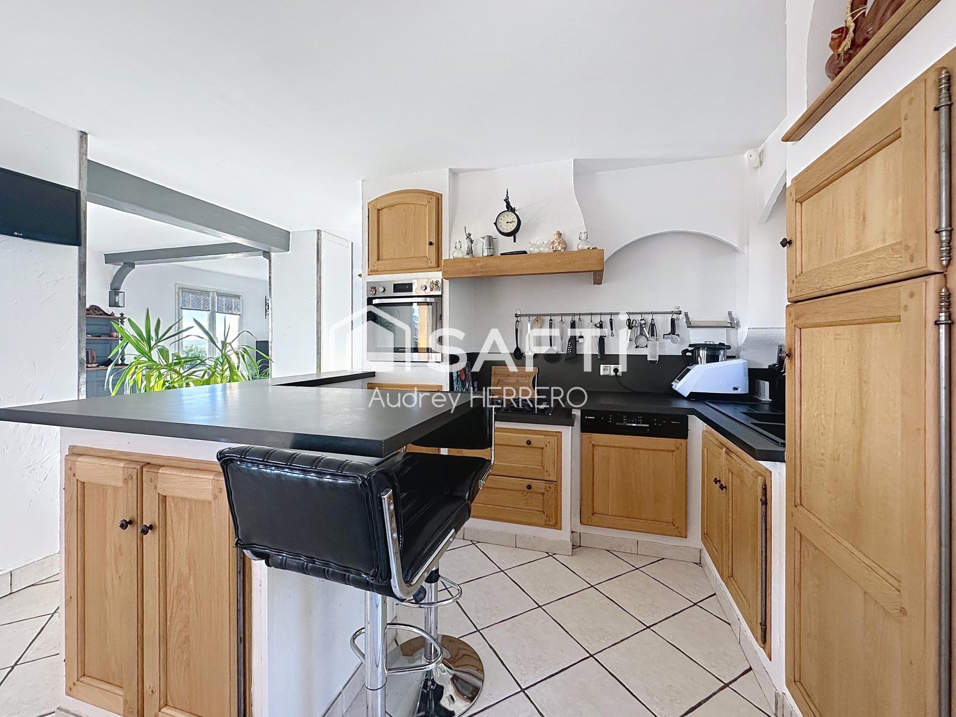 À l'intérieur, cette maison est composée en Rez de chaussée d’une superbe pièce de vie lumineuse avec une cuisine ouverte faite sur mesure par un menuisier, une chambre de plain pied équipée d’une cabine de douche ainsi qu’un WC.